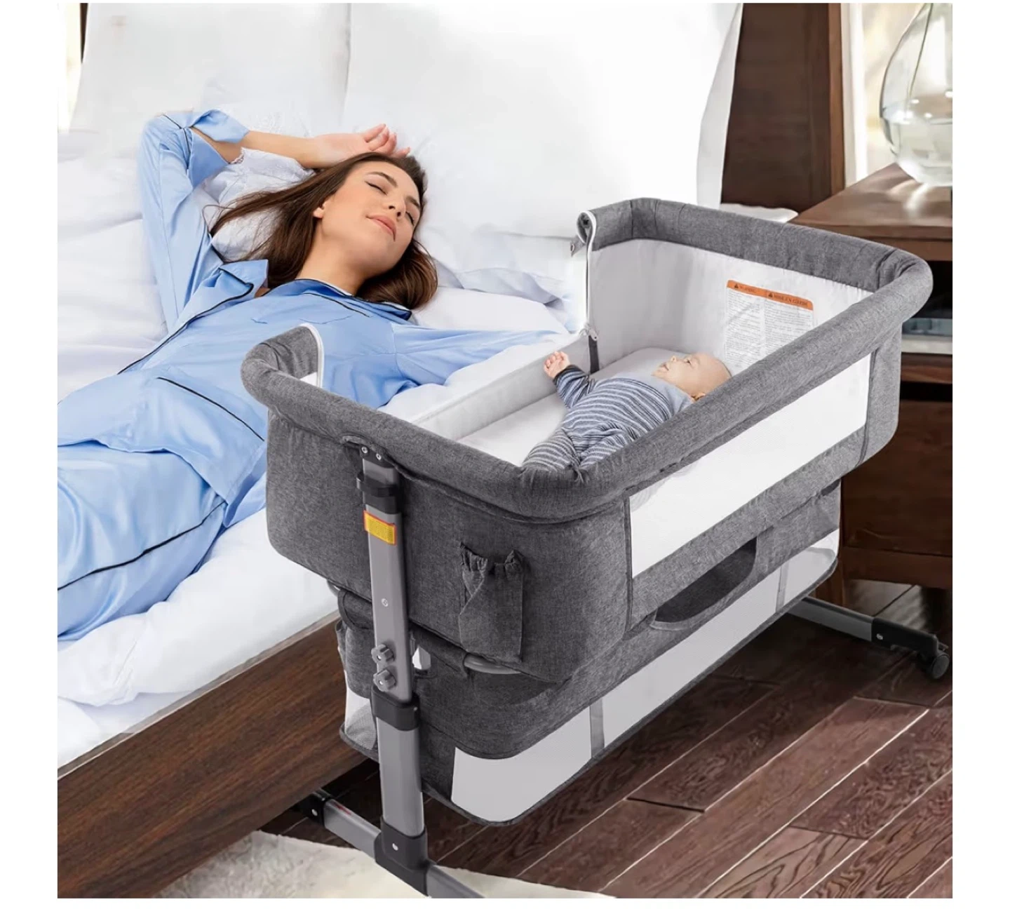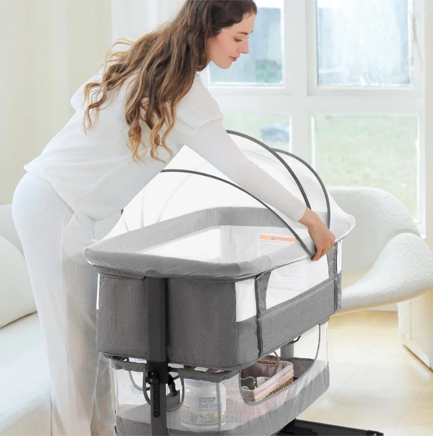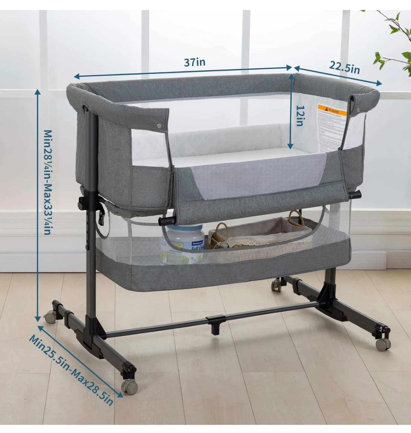 This is a grey bassinet for babies. It has mesh sides for airflow and a mosquito net canopy. The height is adjustable from min 25.5in to max 33.25in. It's great for keeping your baby close by.