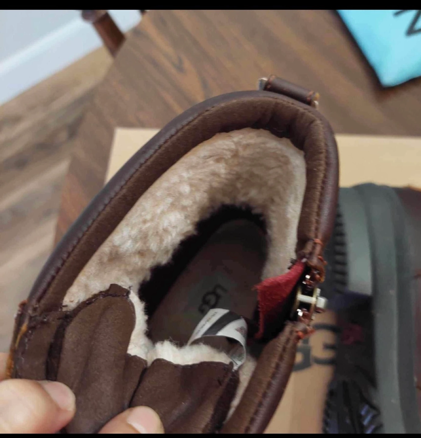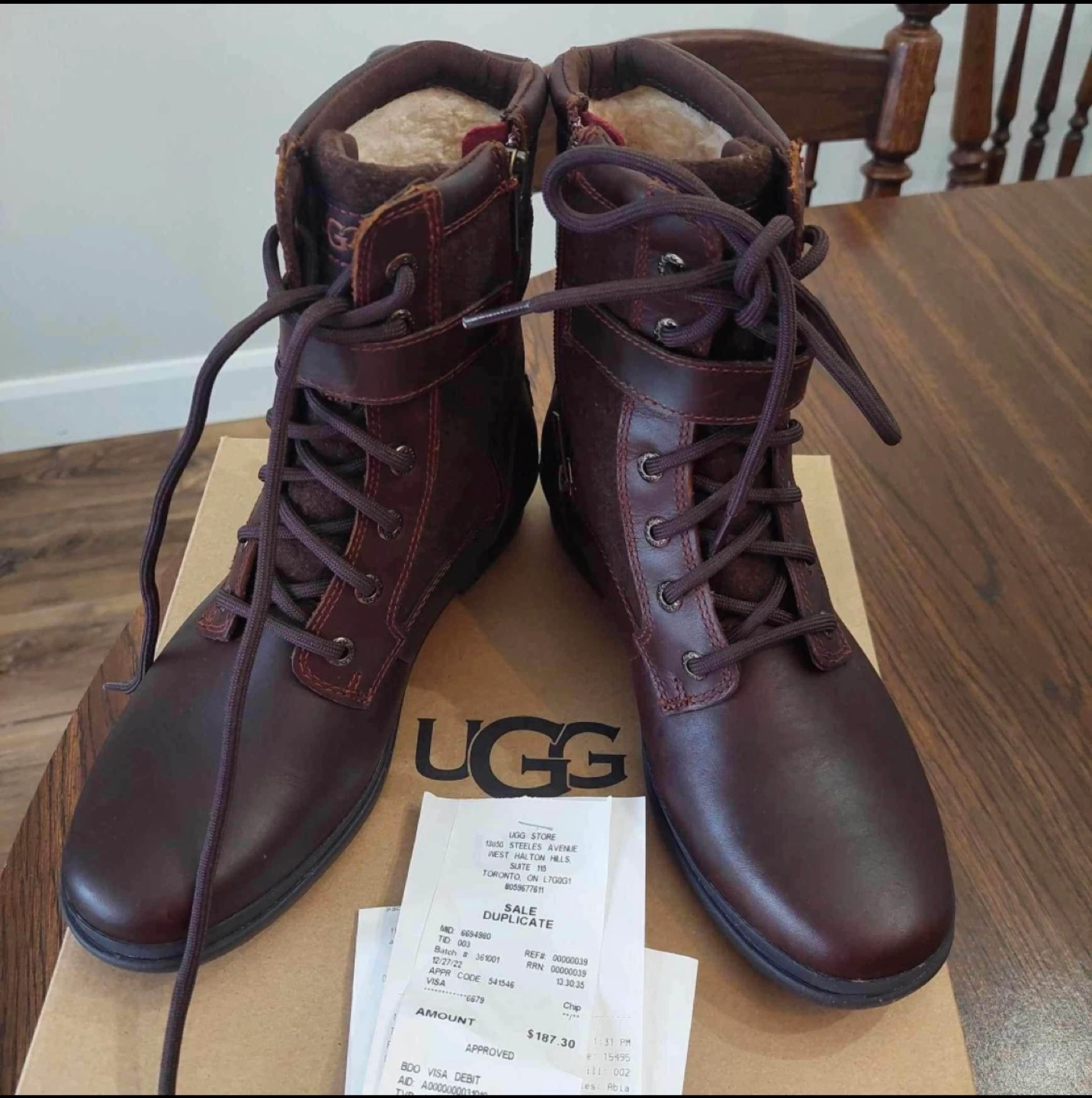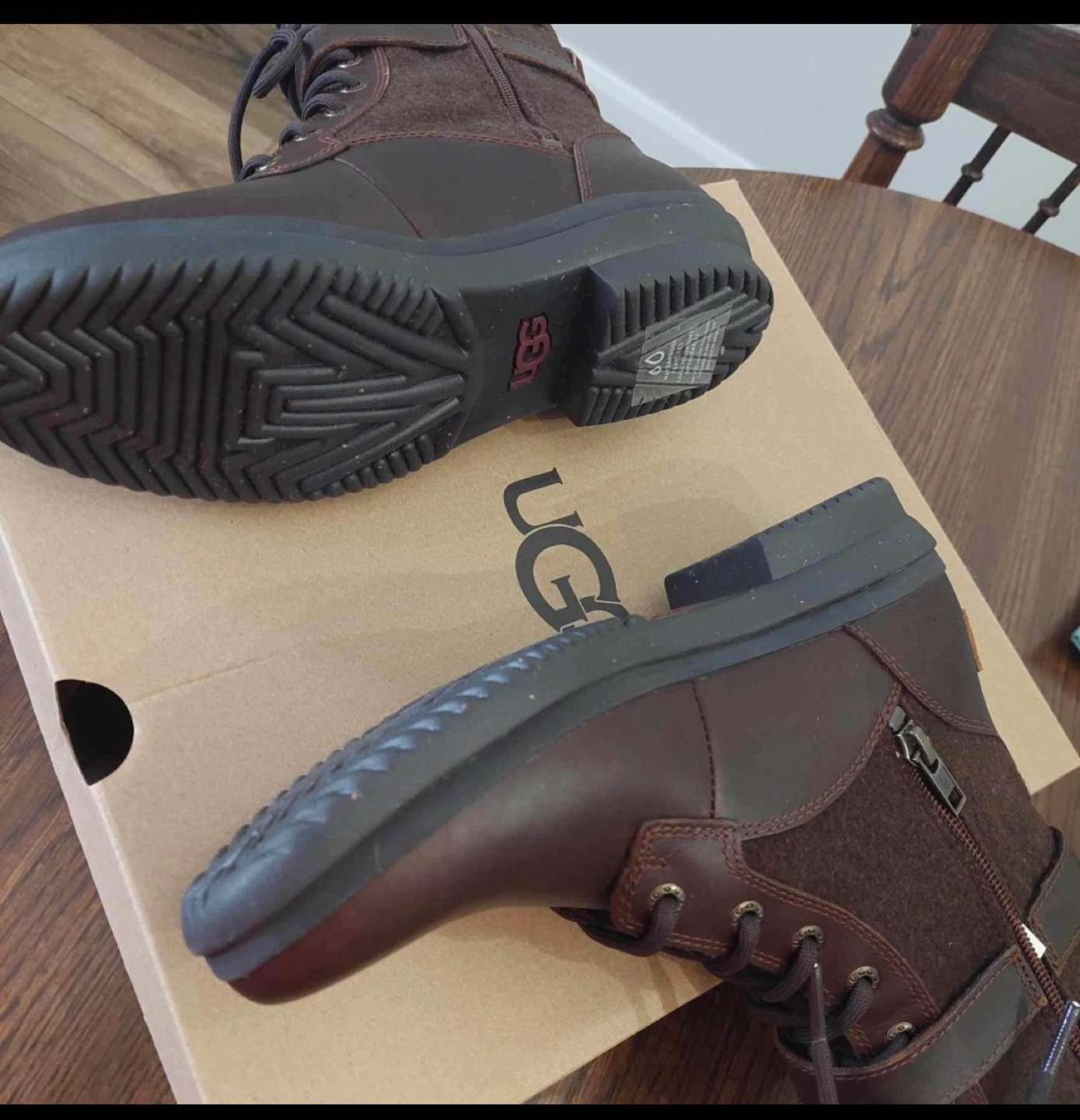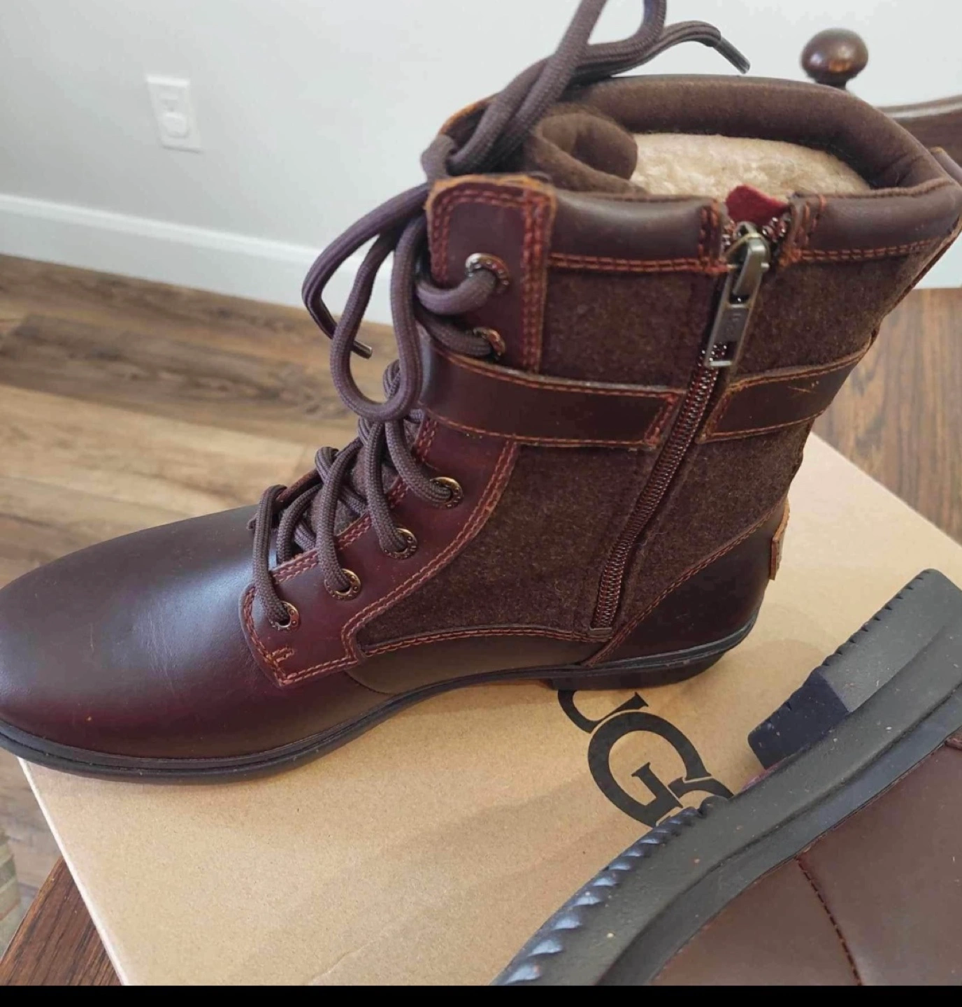 Brown leather UGG Neumel lace-up boots. Side zipper. Warm shearling lining. Great for colder weather. New, in box. Bought $180