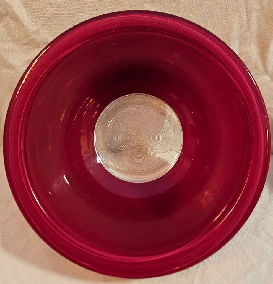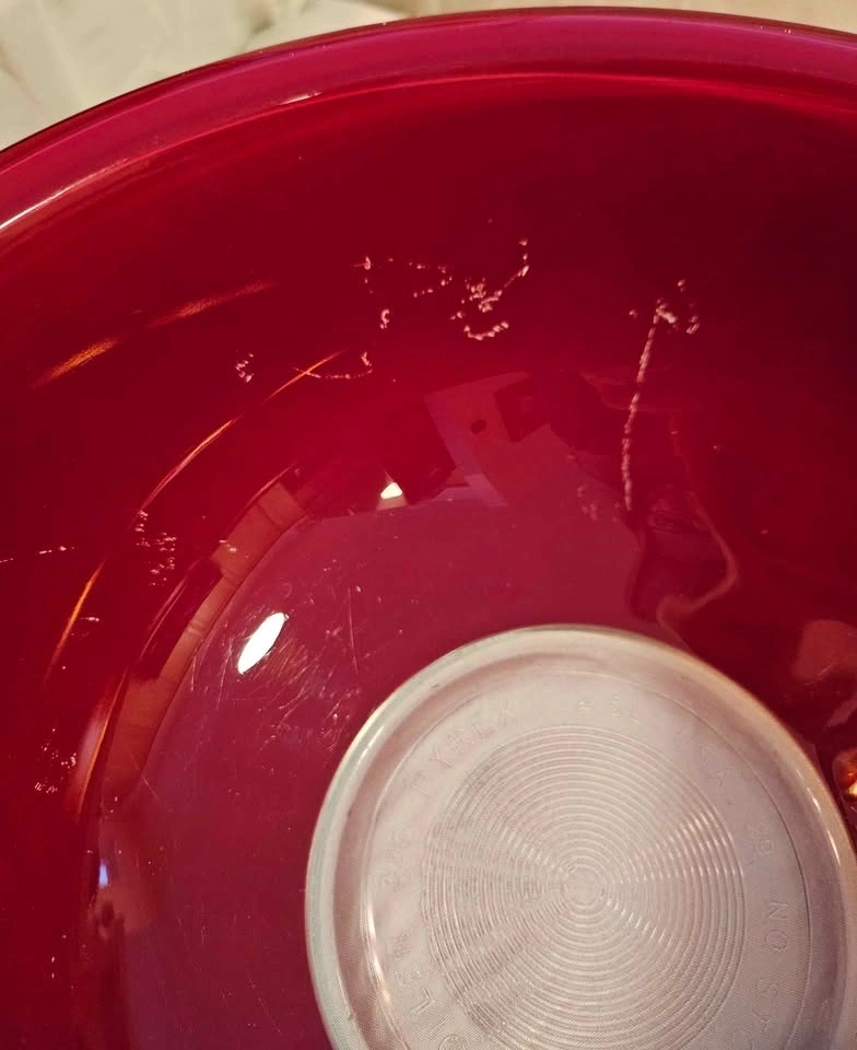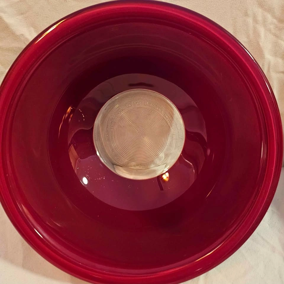 These mixing bowls are from the '80s. There are no chips or cracks. The red color was applied to the outside of the bowl. Please view the photos to see some scratches to the red applique, mainly on the largest bowl. This type of wear is very typical for these bowls. These bowls were used for display only. When stacked, no flaws to the red applique are noticeable. The strong color of these bowls makes for a dramatic display in a white, grey, or black kitchen. Pictures are ordered from the smallest to largest bowl. Largest bowl is 10" diameter, middle bowl is 8 1/4" diameter, and the smallest bowl is 7" diameter. Height when stacked is 4".