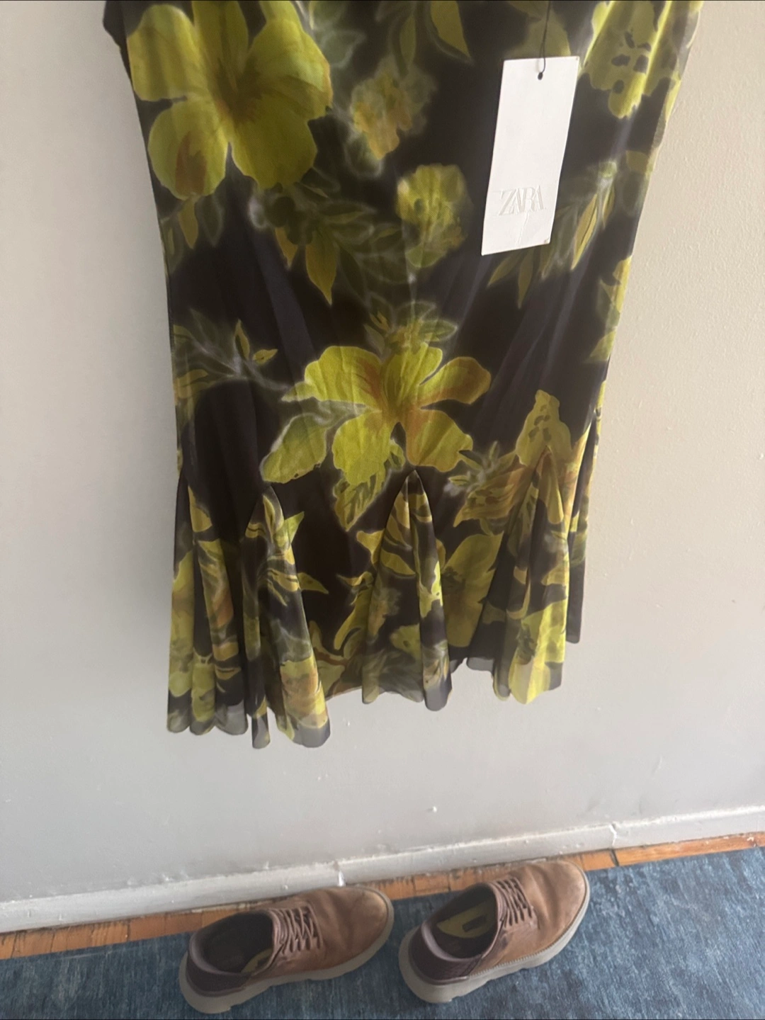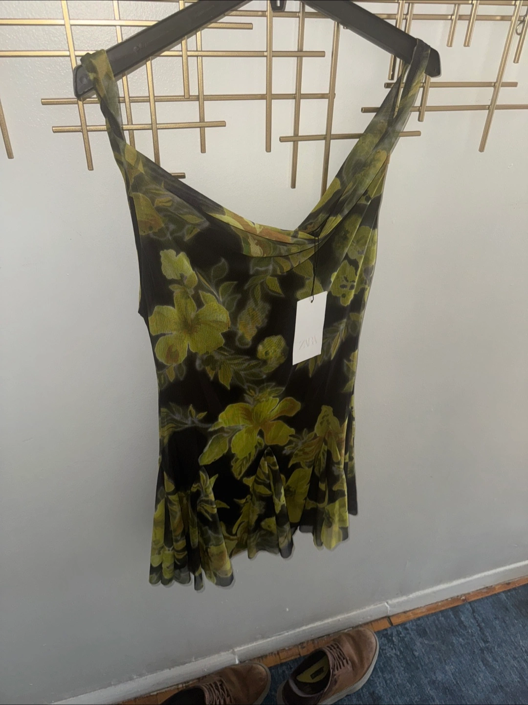 This is a ZARA mesh mini dress with a floral print. It features a cowl neckline and a flounced hem. The material is a lightweight mesh, perfect for layering or wearing on its own.