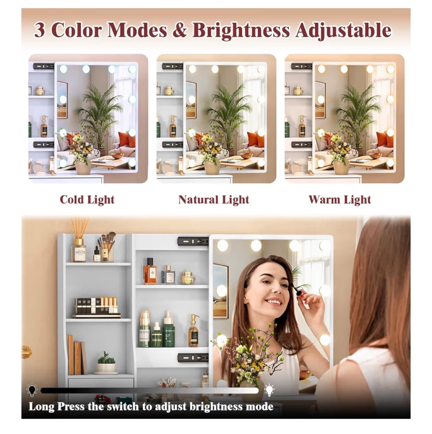 This white vanity set features a lighted mirror with 3 color modes and adjustable brightness. It includes a storage cabinet with shelves and drawers, along with a matching stool. It’s new and assembled, one drawer slide is missing