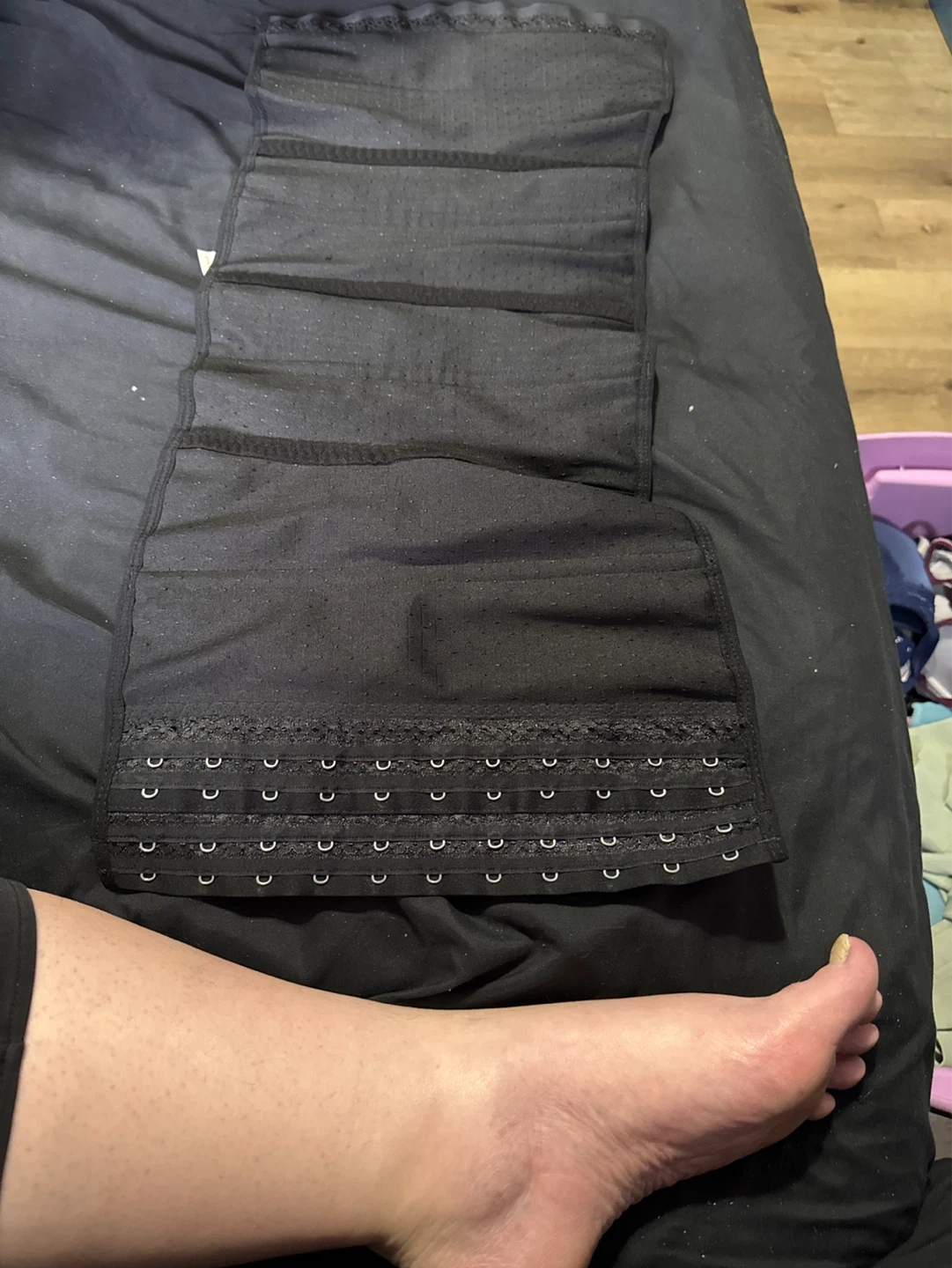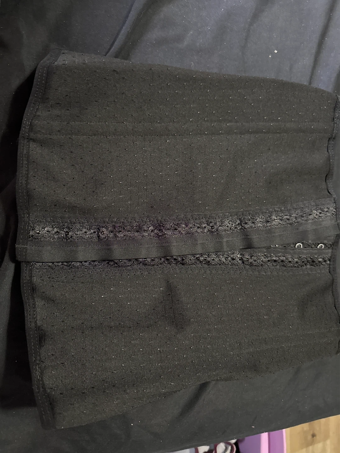 This black waist trainer band offers adjustable compression. It's made from a breathable mesh material with hook-and-eye closures for a secure fit. Great for everyday wear or post-partum support! Size 34