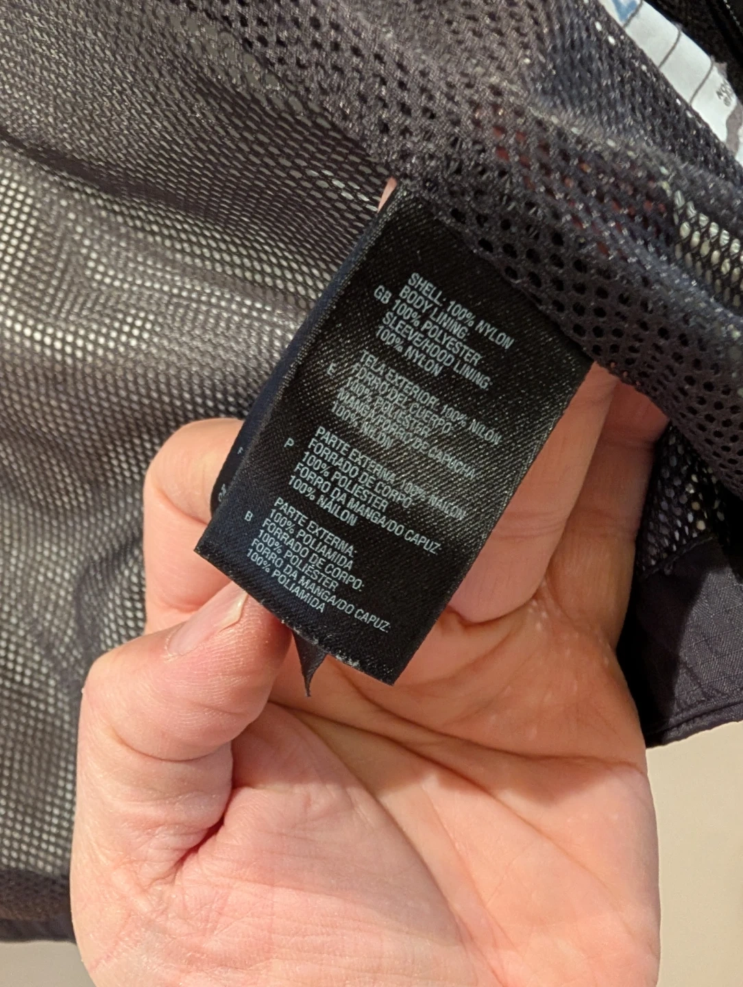 The North Face boys' black rain jacket in size L/G. The shell is made of 100% nylon, and the body and sleeve/hood lining are also 100% nylon. There is an interior mesh lining.
