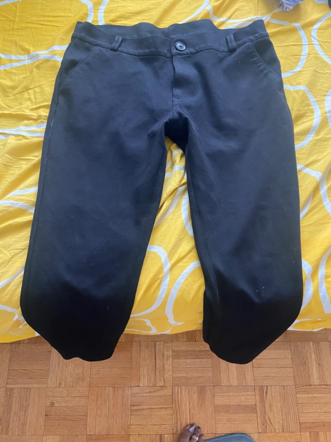 Black capri pants with a button closure and two front pockets. These pants are a size medium.