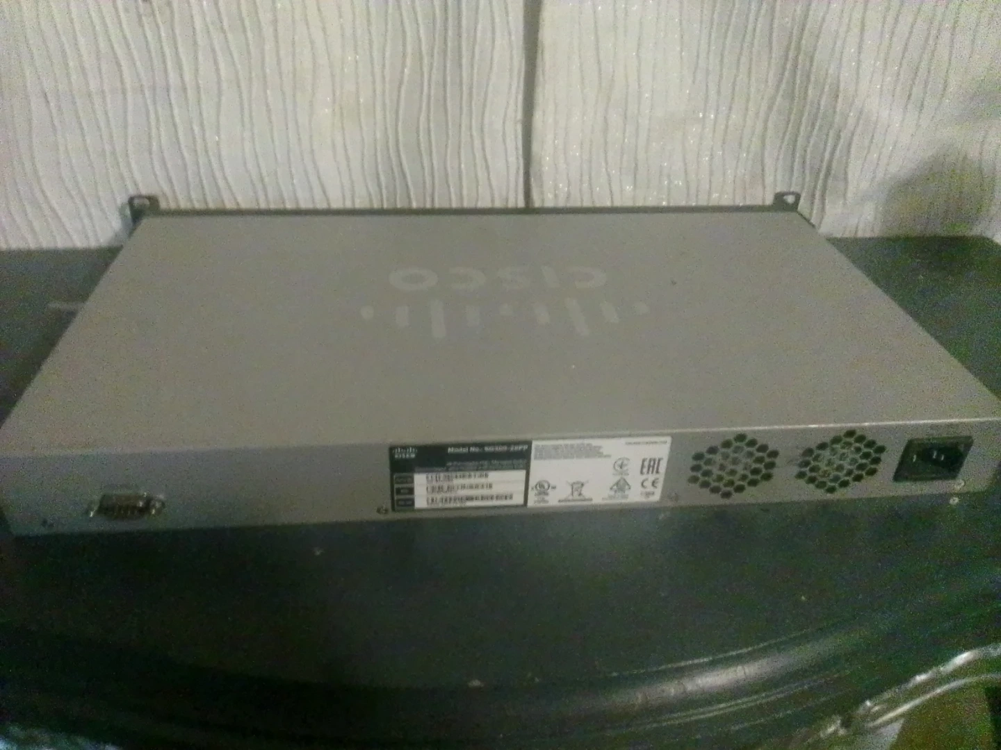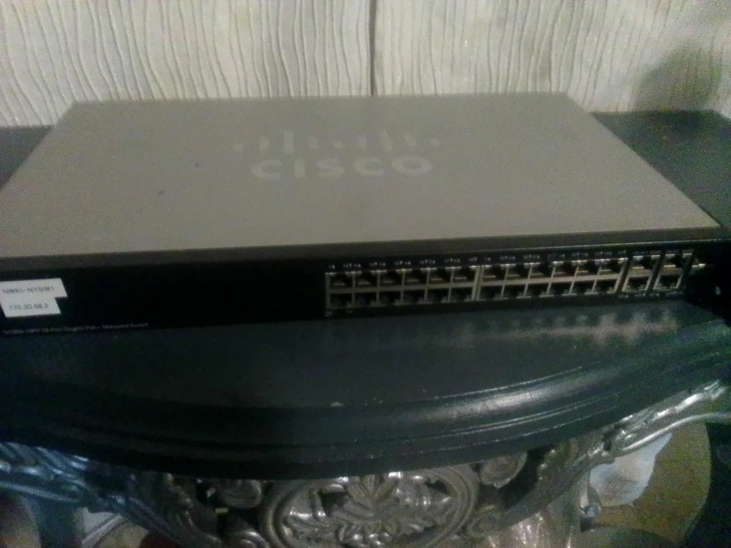 This is a Cisco SG200-26P 26-port smart managed switch. It offers Power over Ethernet (PoE) capabilities. 24 Gigabit Ethernet ports and 2 combo mini-GBIC/Gigabit Ethernet ports.