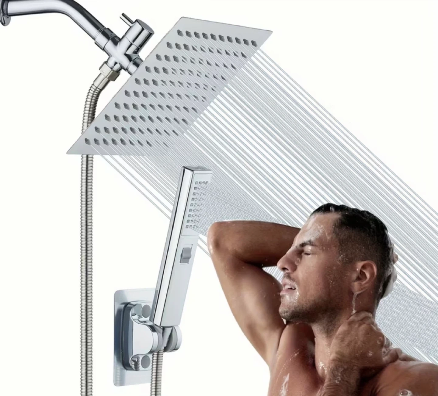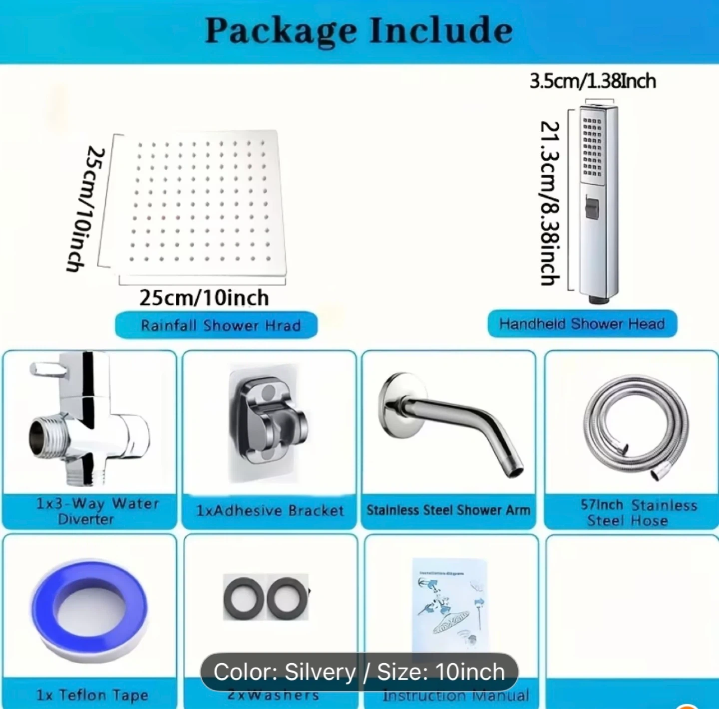 This is a 10-inch square rainfall shower head with a handheld sprayer. It's made of stainless steel and comes with a diverter, hose, and adhesive bracket.