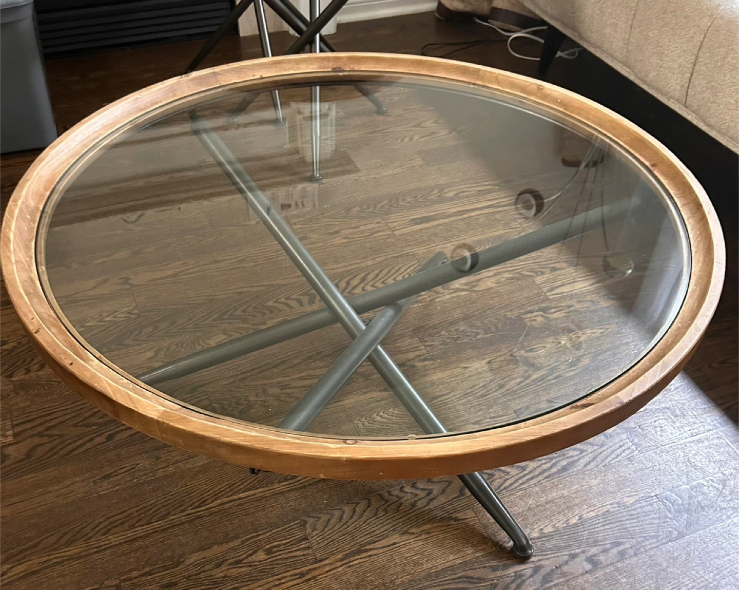 Set of two nesting side tables featuring round glass tops with wooden rims. The bases are made of dark metal with a modern cross-leg design. These tables are perfect for adding a touch of style and convenient surface space to your living room.