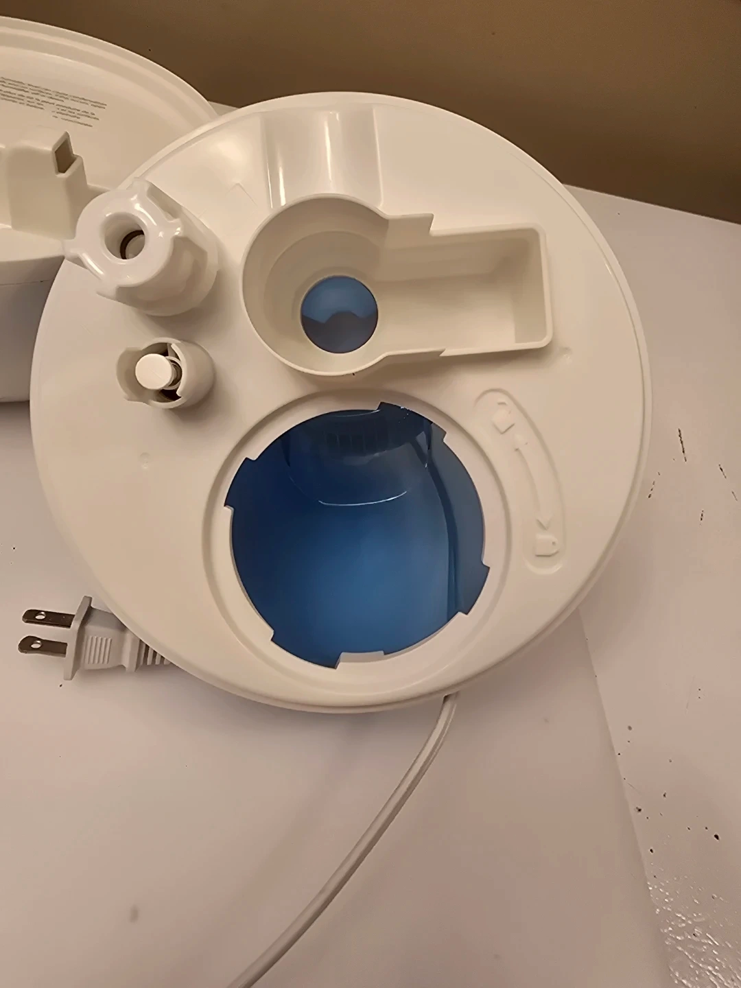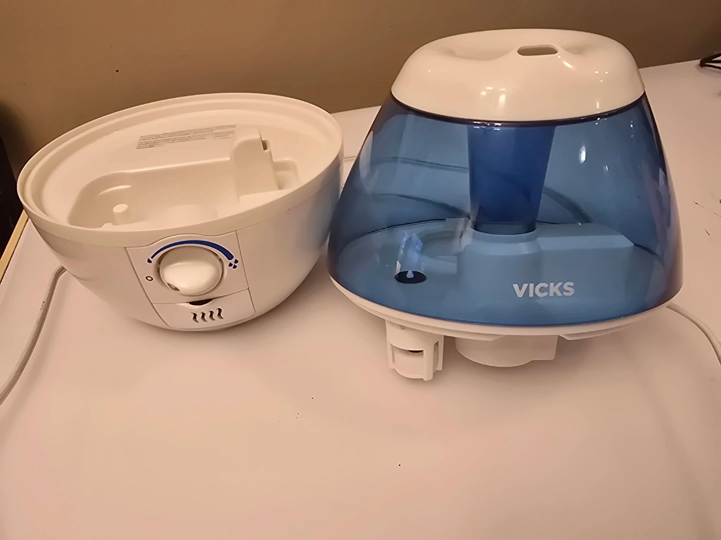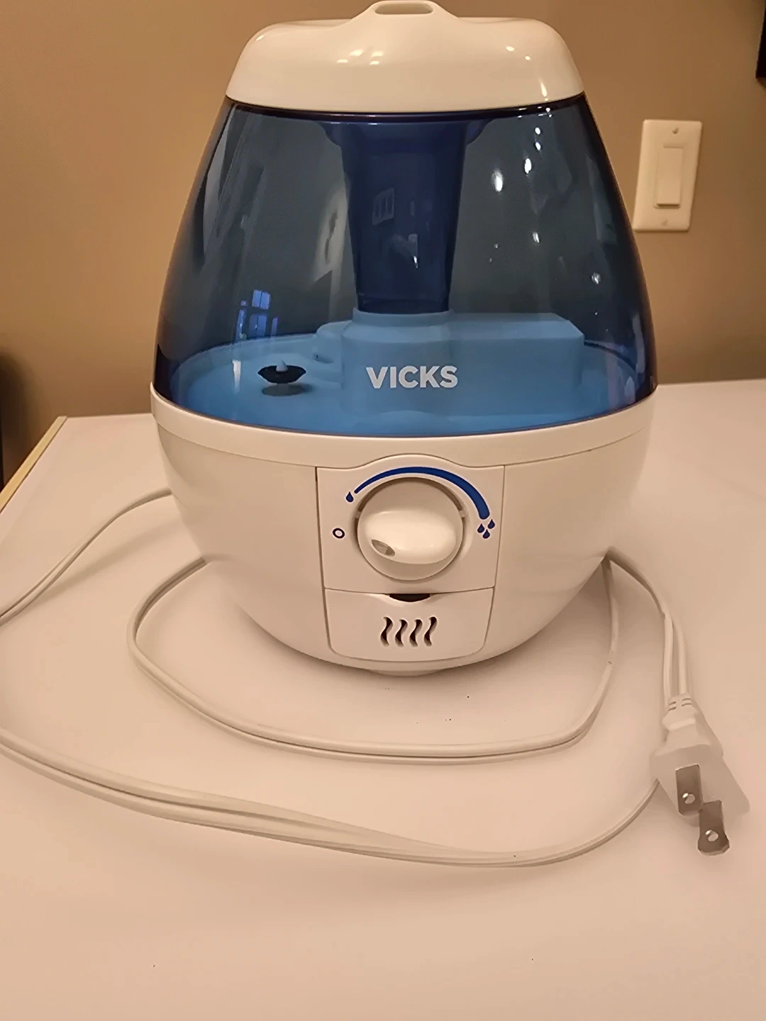 This Vicks humidifier helps to add moisture to the air. It features an adjustable mist control knob. The water tank is a translucent blue for easy visibility.