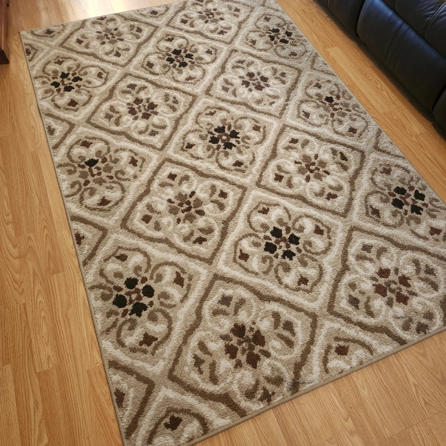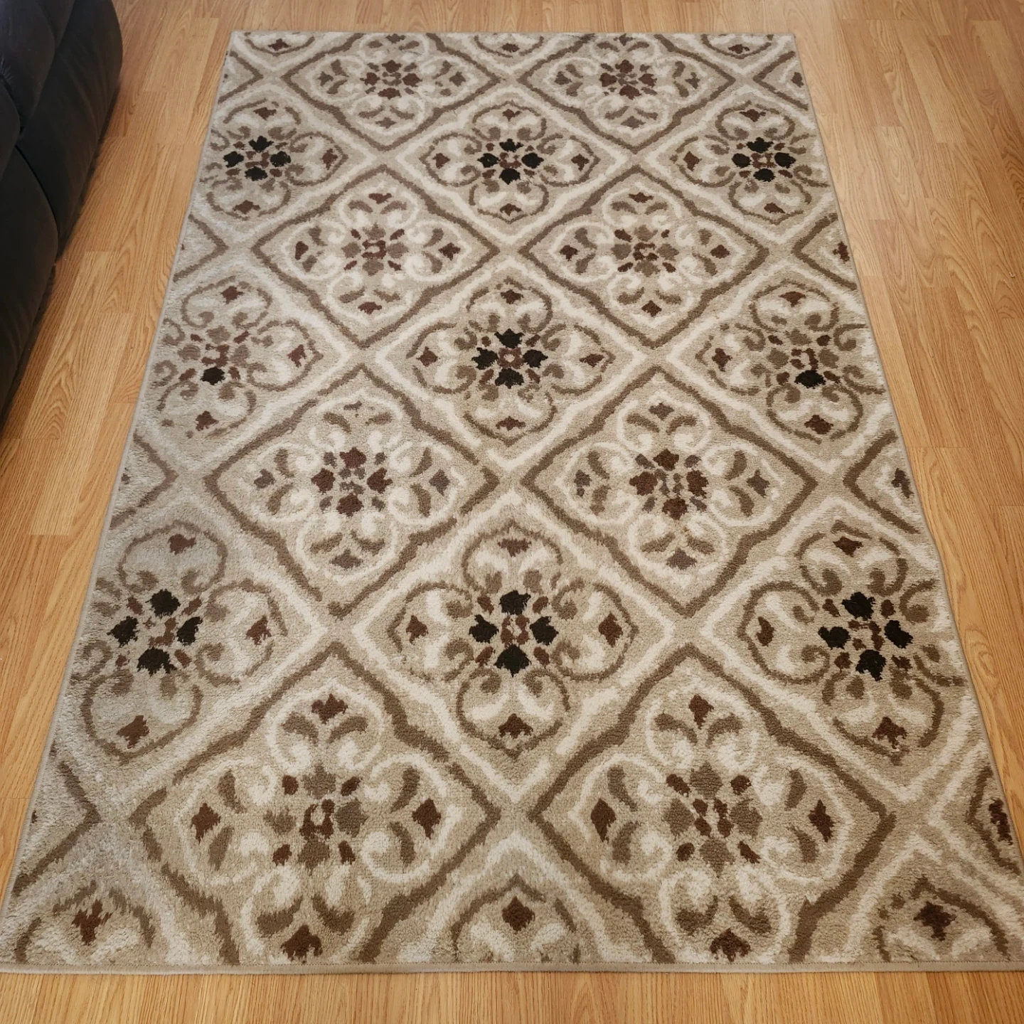 This area rug features a timeless geometric quatrefoil pattern in neutral tones of beige, brown, and cream. It's made from a soft, plush material suitable for living spaces. The neutral colour palette makes it easy to match with various decor styles. Used but no cuts, rips or stains. Paid $140 new. Firm $10.00.