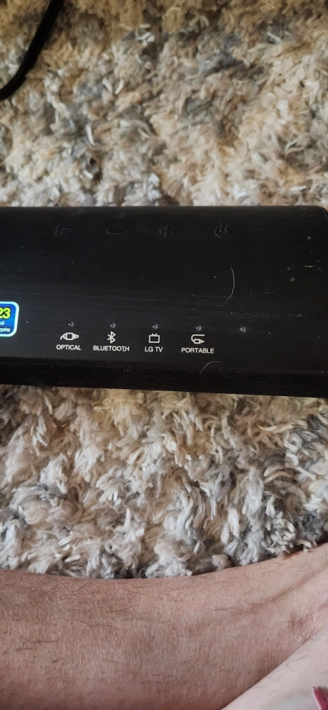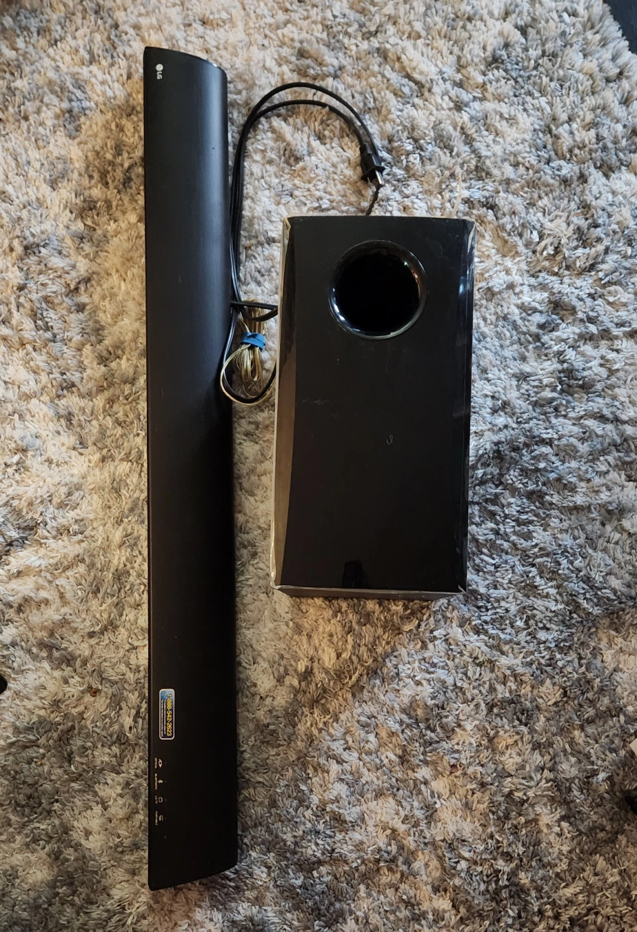 LG soundbar and subwoofer system. Black. Features Bluetooth, optical, and LG TV connections. Good used condition. Minor paint drops on woofer, otherwise hardly used. Have to sell as neighbors complaining! 😊