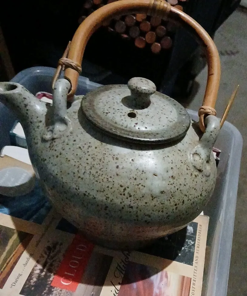 Here's a lovely speckled ceramic teapot with a bamboo handle. It's perfect for brewing your favourite tea and adding a touch of rustic charm to your kitchen. It's in great condition and ready for a new home!