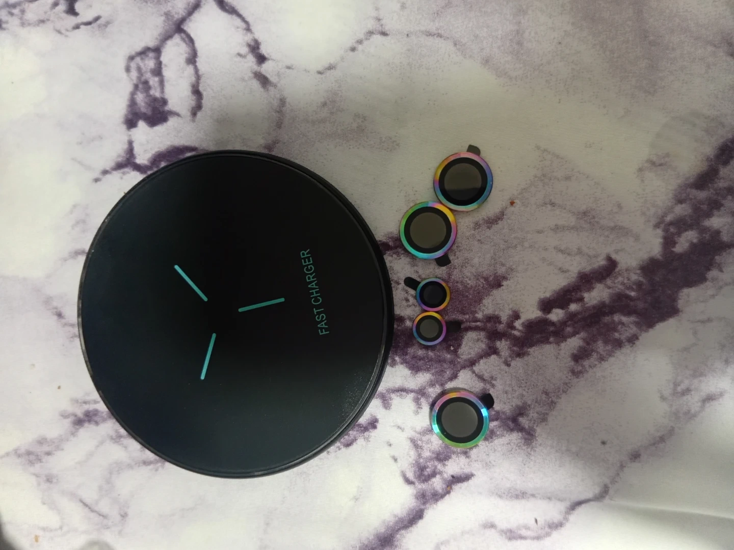 This is a black fast charger with a colourful design on the base. It also comes with a set of rainbow-coloured lens protectors. These protectors are designed for phone cameras. They're great for adding a touch of style while protecting your lenses!