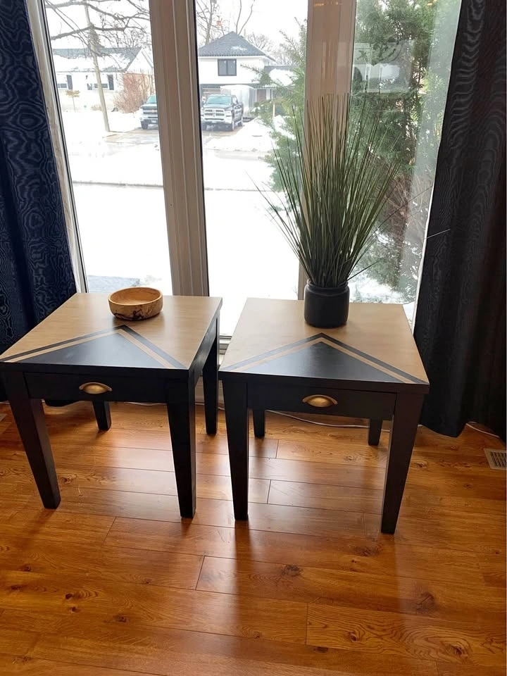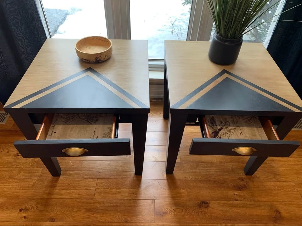 These refinished solid wood modern side tables feature a walnut glaze and black finish with a contrasting geometric chevron design. The drawers have been cleaned and freshly lined with a nature theme. New gold cup-style drawer pulls have been added. Legs are painted in Benjamin Moore's 'Black Tar'.