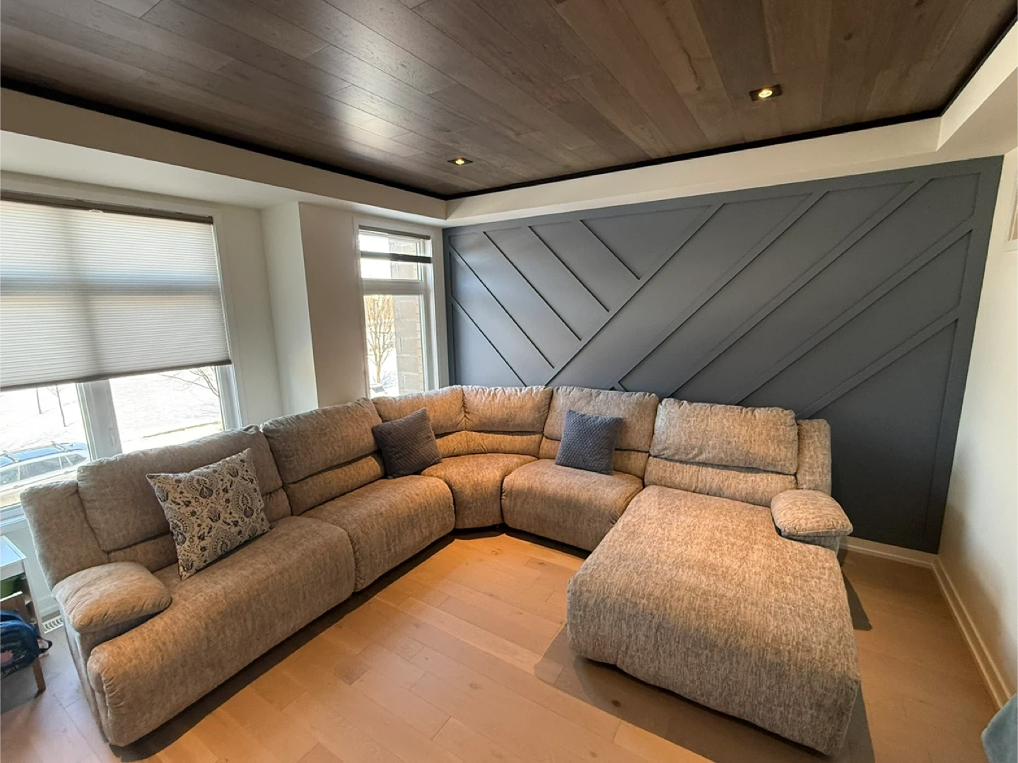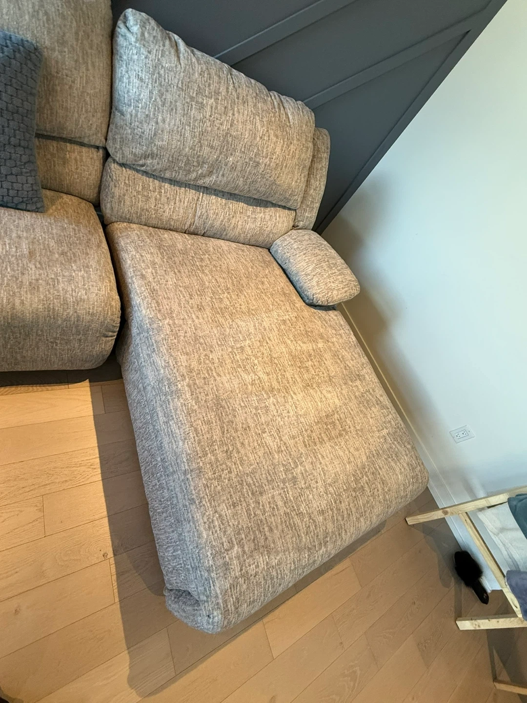 Comfortable sectional sofa with a chaise lounge. Upholstered in a textured, neutral fabric. Features plush cushions and adjustable headrests. Perfect for a large living room or family room!