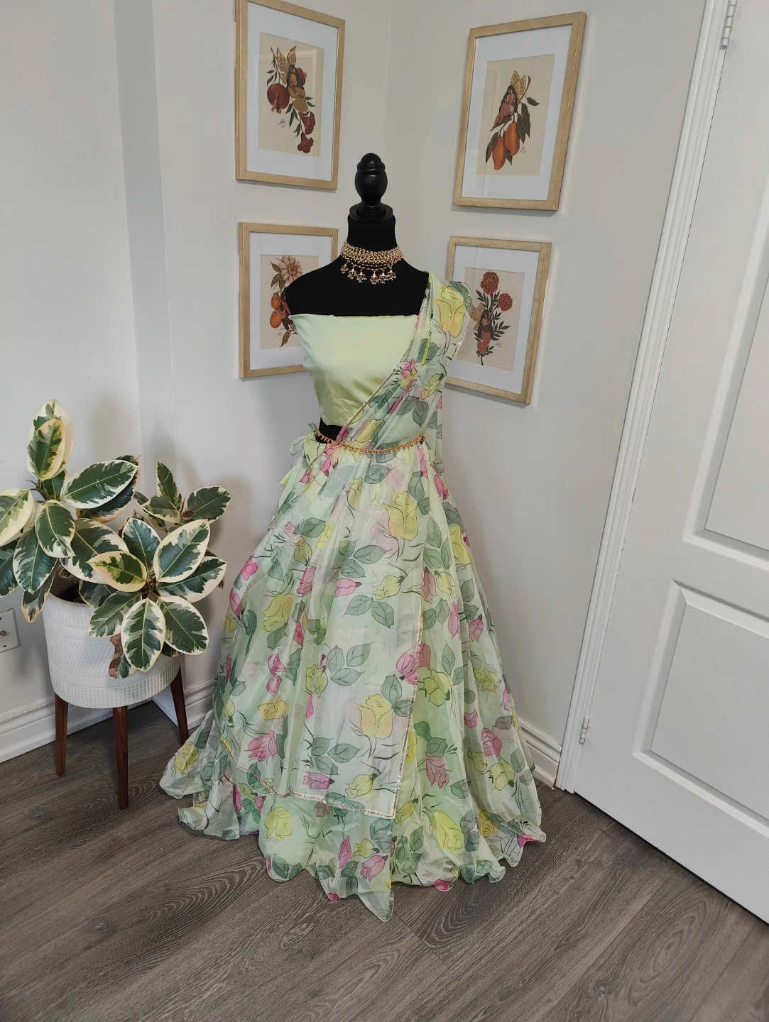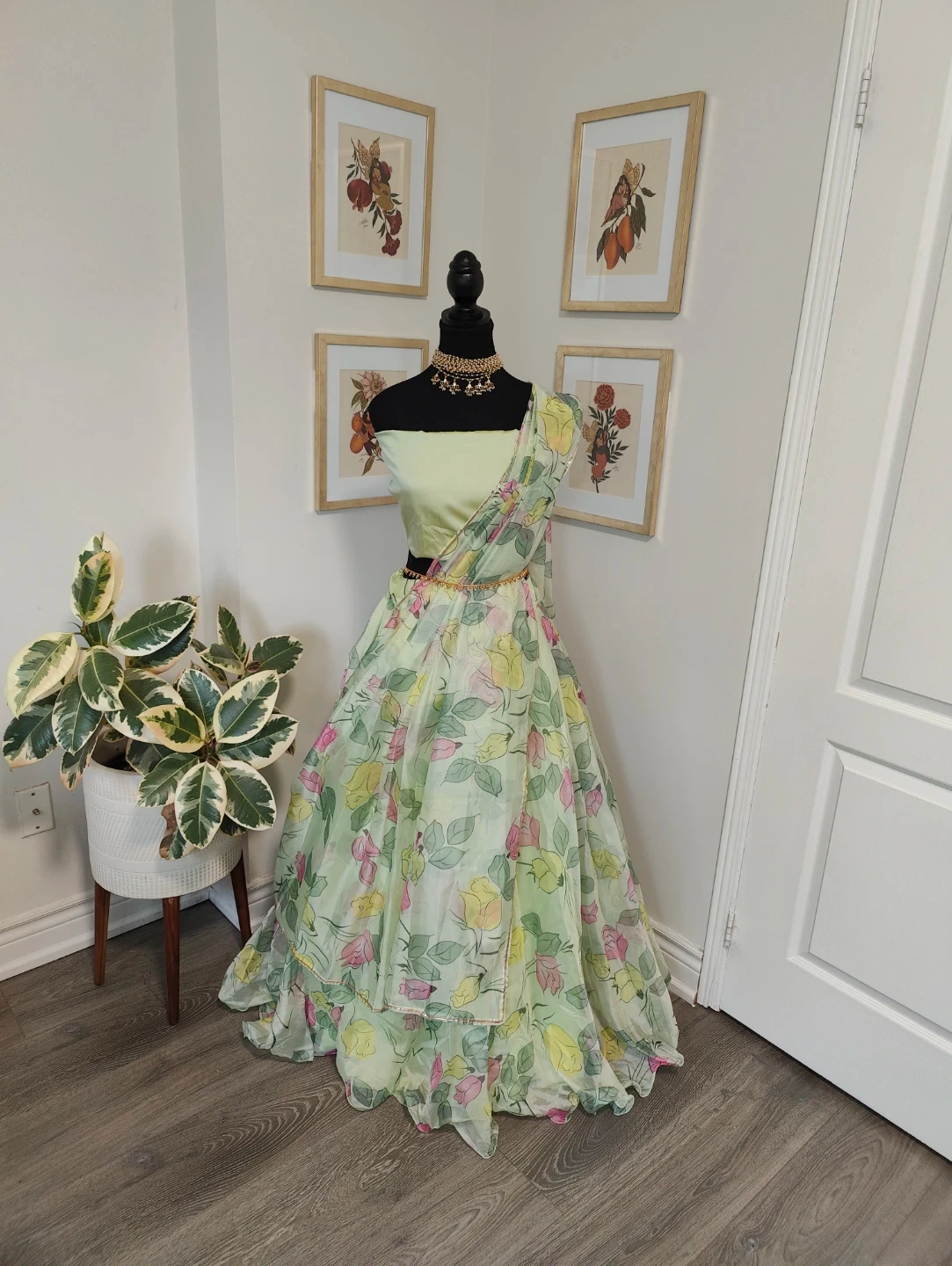 Light green floral print lehenga choli set with a matching dupatta. The fabric is lightweight and flowy, perfect for festive occasions. This outfit features a unstitch blouse and a long skirt with a beautiful floral design. It's a stunning choice for cultural events or parties!