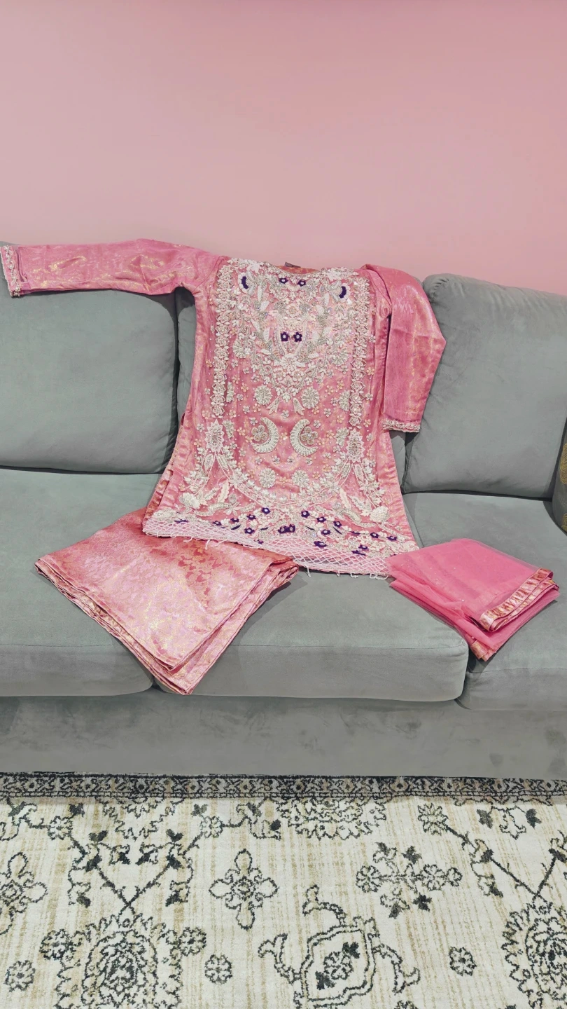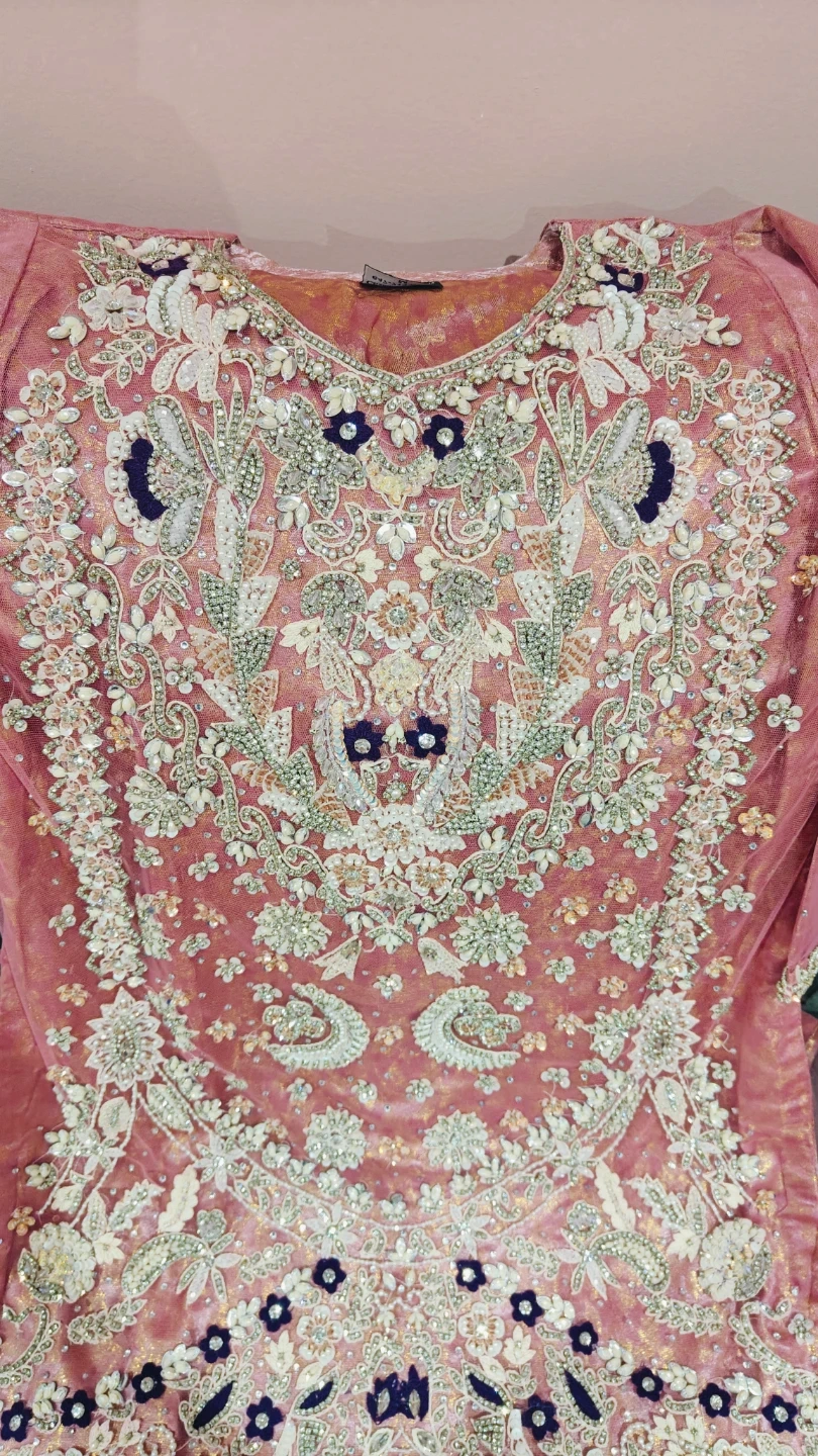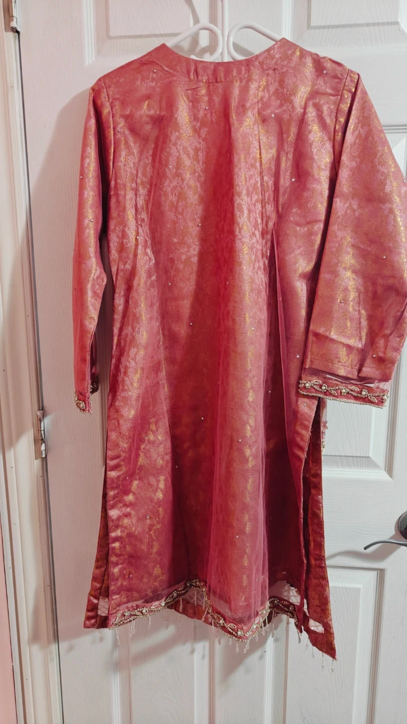 Beautiful pink kurti, garara, and dupatta set. Intricately embellished with beads and sequins. Perfect for special occasions!