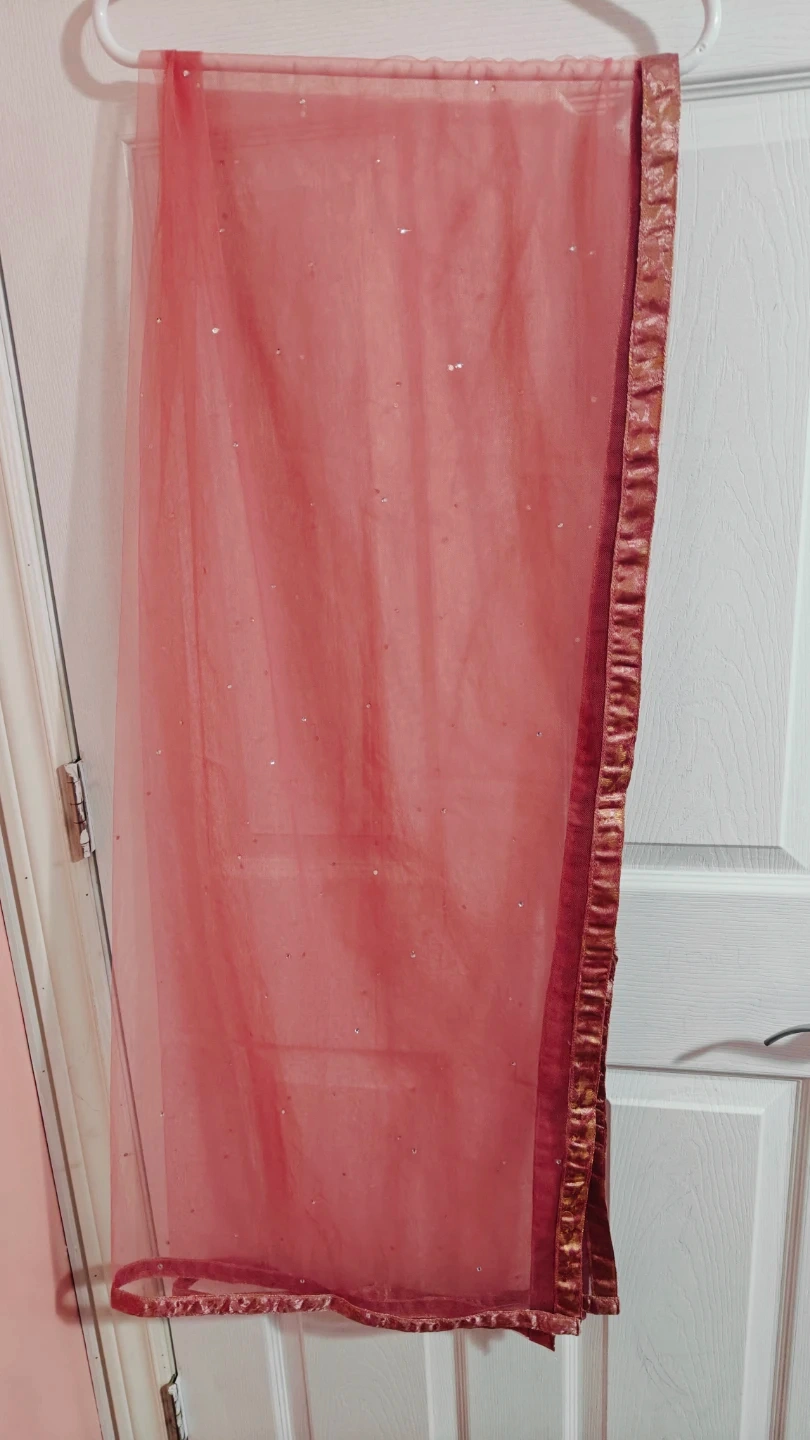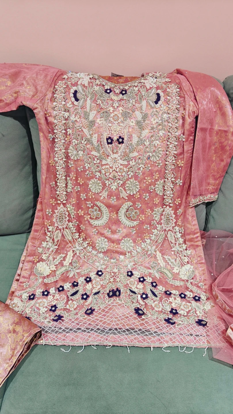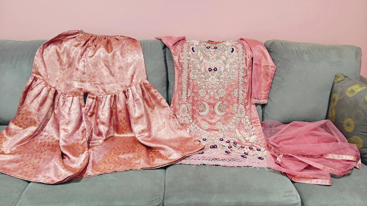 Beautiful pink kurti, garara, and dupatta set. Intricately embellished with beads and sequins. Perfect for special occasions!