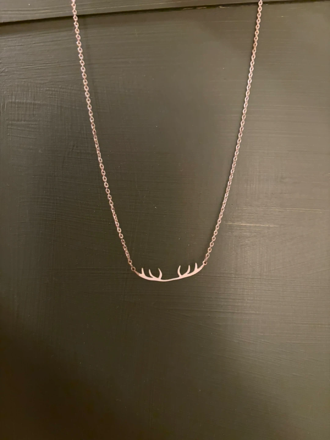 A delicate necklace featuring a silver-tone antler pendant. The chain is thin and silver-colored. It's a simple, elegant piece.