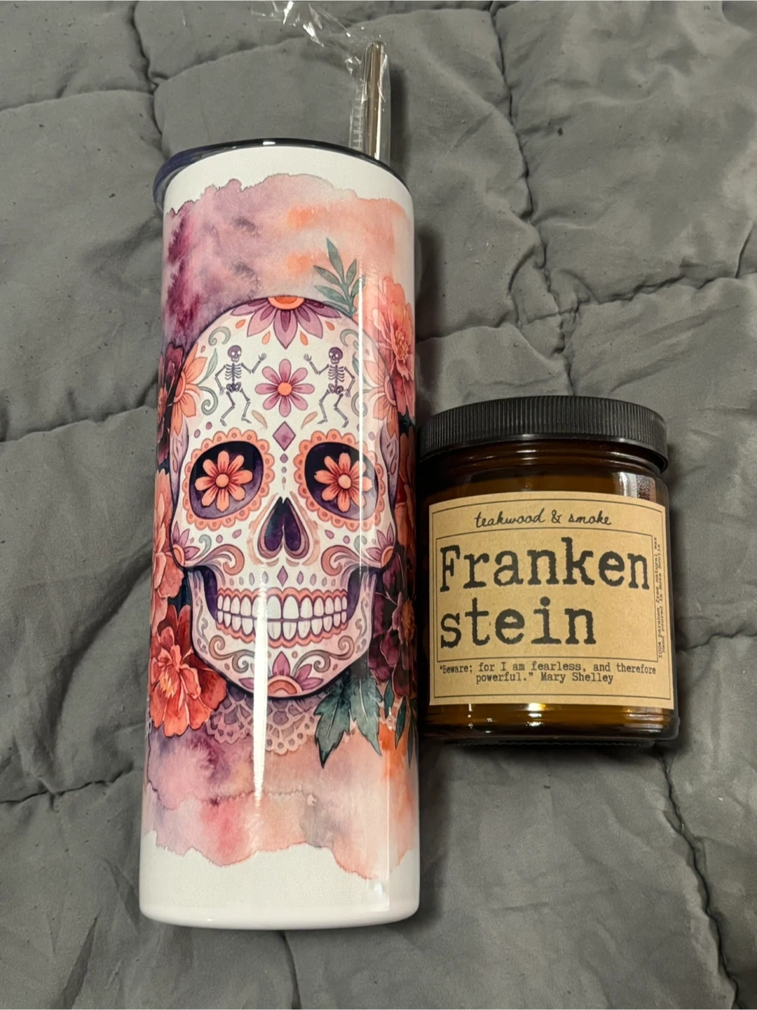Sugar Skull Tumbler and Frankenstein Candle Set