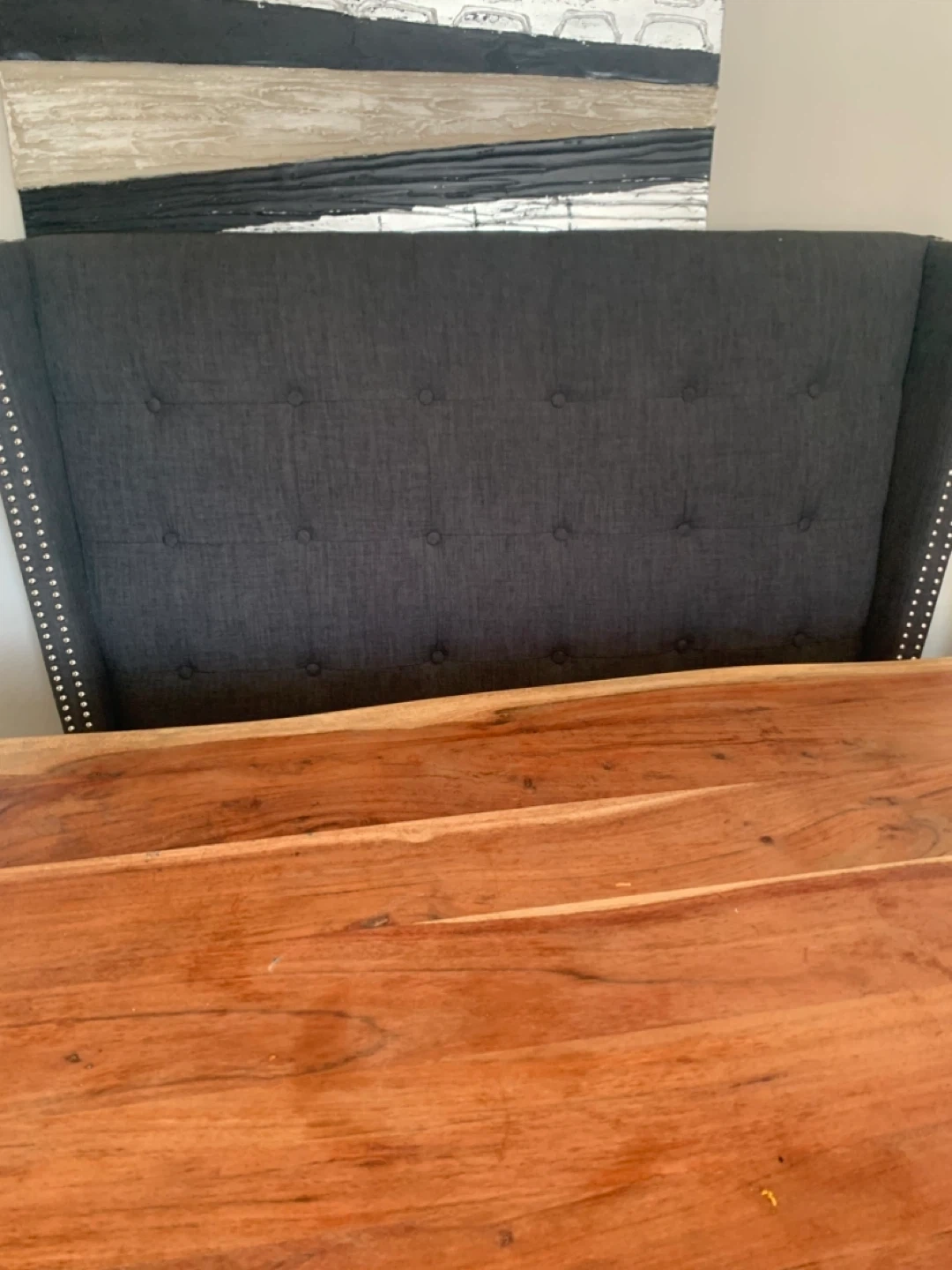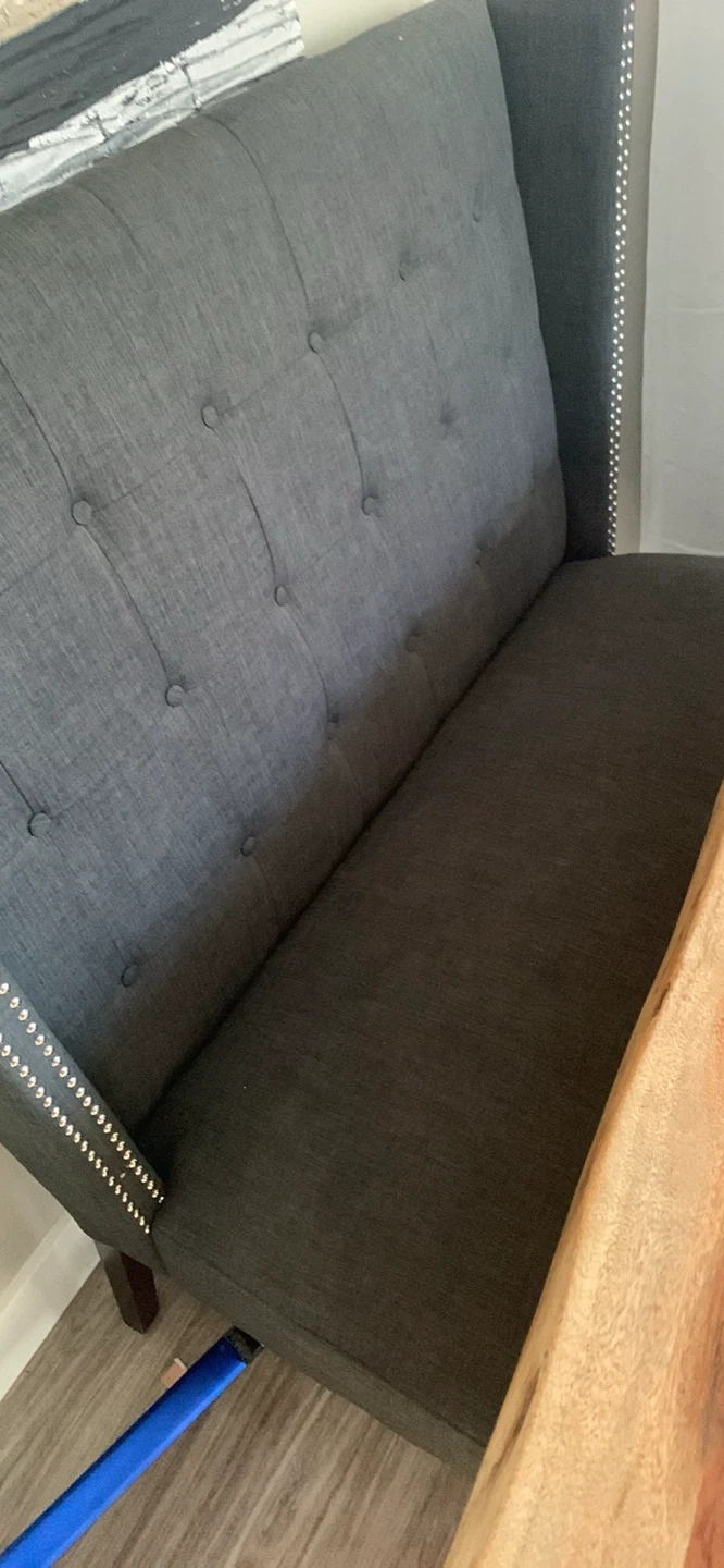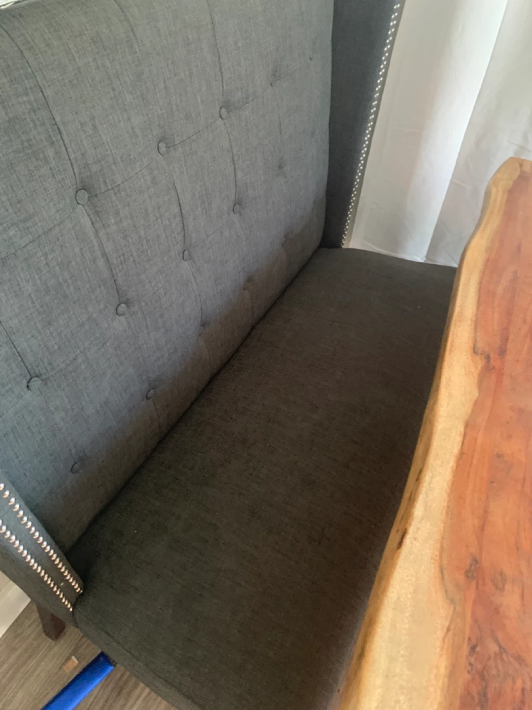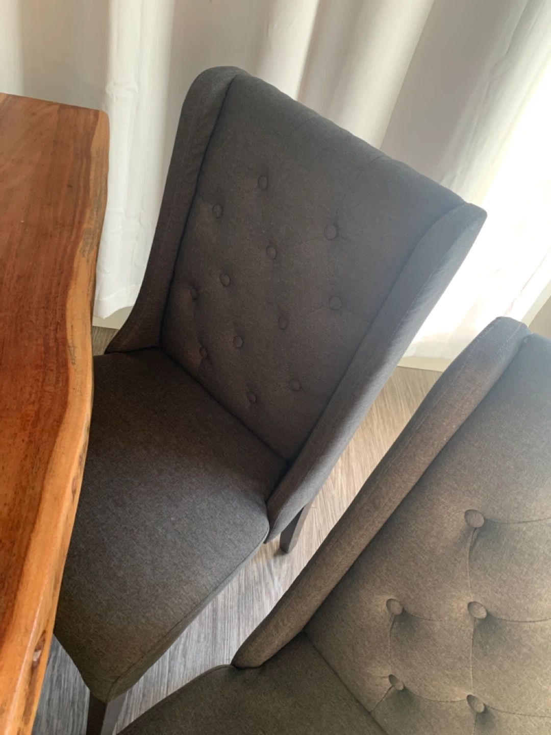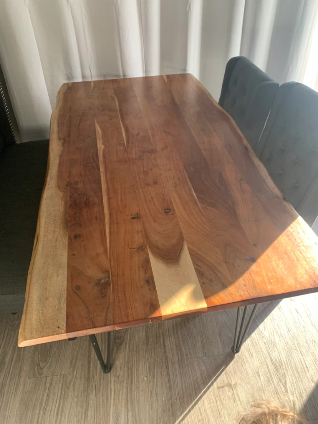 Beautiful live edge dining table with two upholstered chairs and a bench seat. The table features a natural wood top with a live edge finish and metal hairpin legs. Chairs and bench are upholstered in a dark grey fabric with tufted detailing.