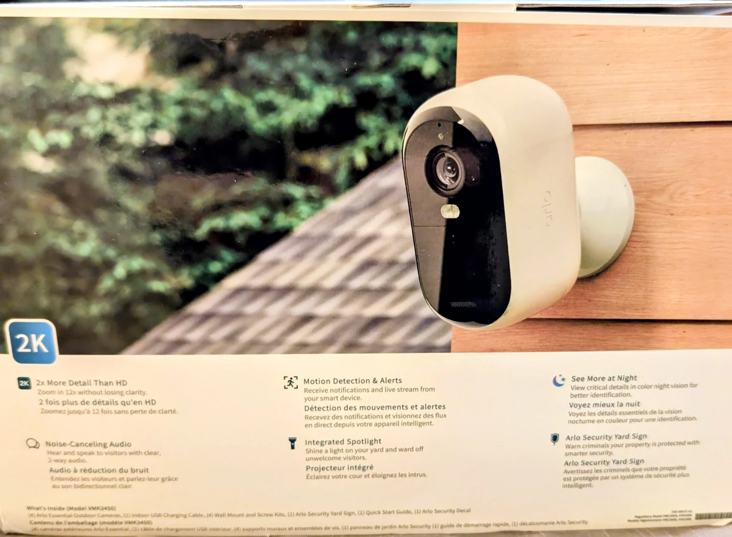 This is a 4-pack of Arlo Essential Outdoor Cameras. These cameras feature 2K video, color night vision, and two-way audio. They are battery-powered for flexible placement.