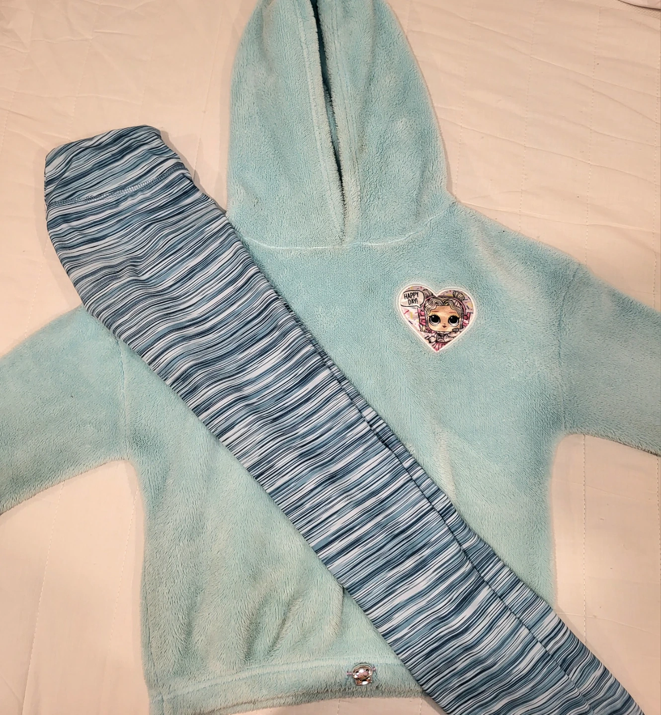 Comfy teal fleece hoodie with a fun LOL Surprise patch. Matching striped leggings complete this outfit. Made from 100% polyester.