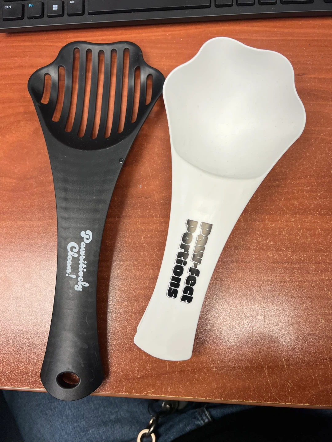 This set includes a white scoop labeled "Paw-fect Portions" and a black slotted scoop labeled "Paw-sitively Clean!". They're designed for portioning pet food. And cleaning litter boxes