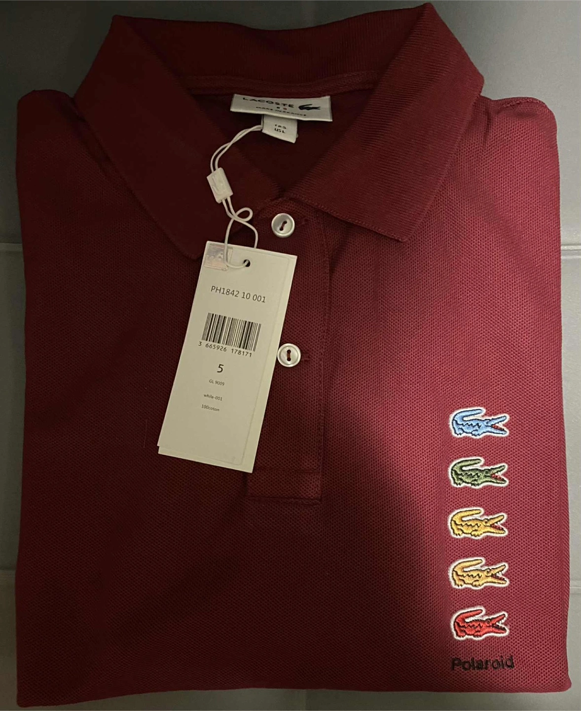 A polo shirt, burgundy in colour, with a button-up collar. Embellished with the Polaroid logo and the Lacoste crocodile. You could wear this shirt while going out for a relaxing day.