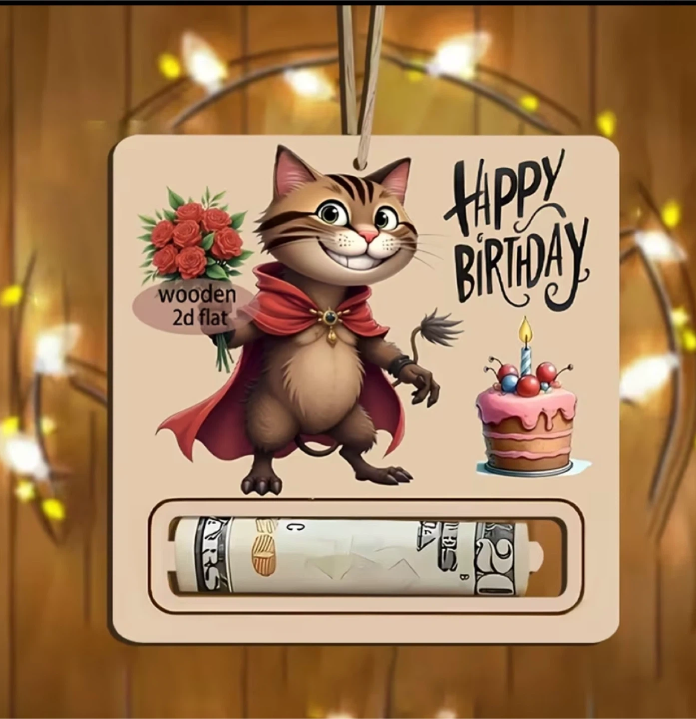 This is a wooden 2D flat happy birthday gift wallet card. It's 10cm by 10cm and 3.94 inches square. It has a slot to hold a rolled-up money.