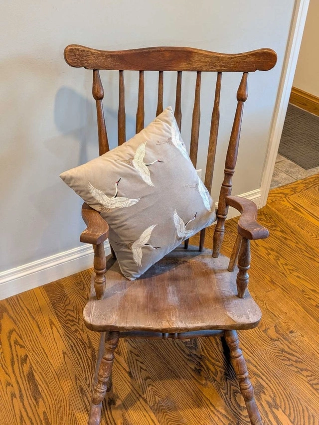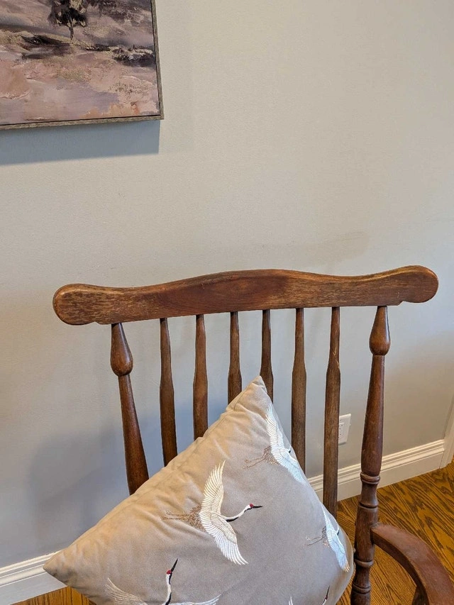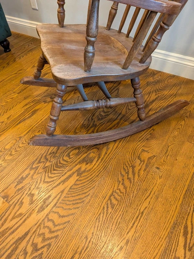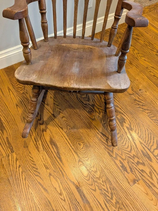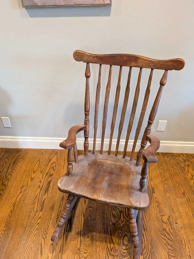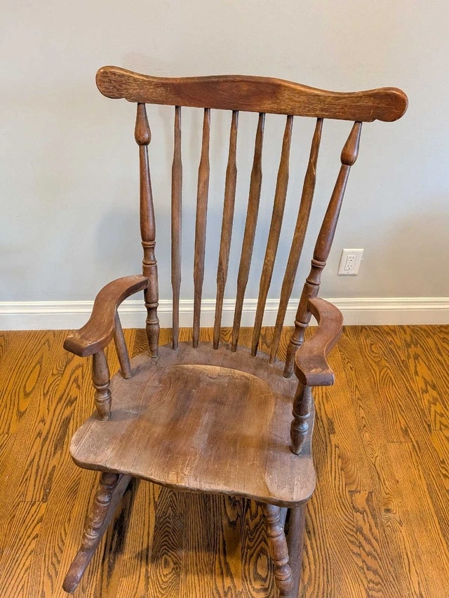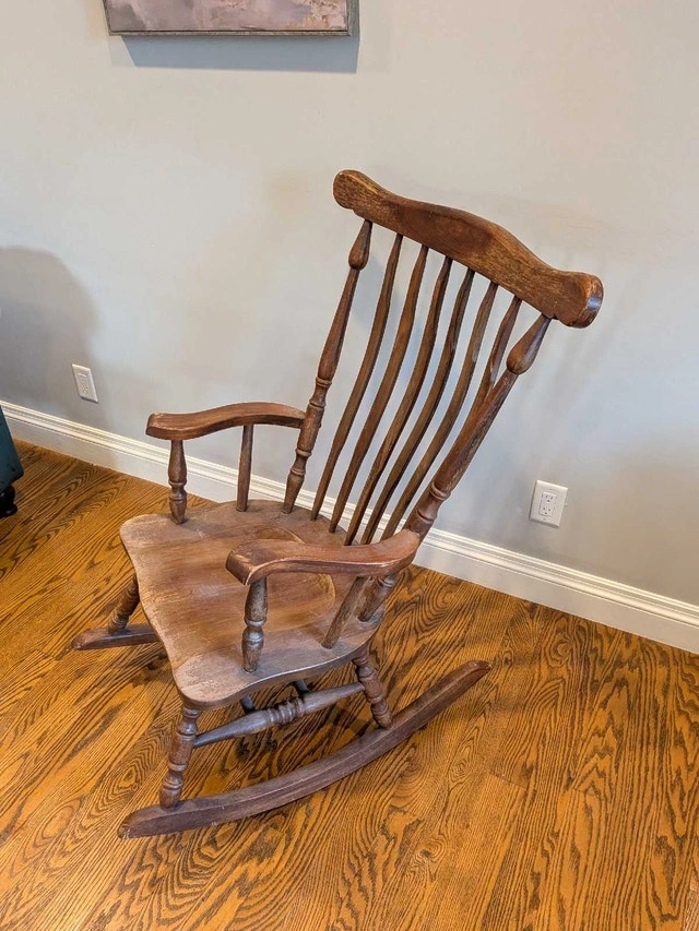 Vintage solid wood rocking chair in great condition for its age! Could be used as is, adding charm to a cottage or home, or could be refinished as you desire.