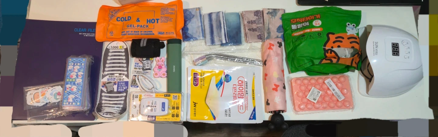22Hydrocolloid bandages $5 / Adapter $4 / Large gel nail lamp $3 / Two A4 folders set $2 ⬇️ Everything below is $1 each: Ice & hot packs / Ice tray / Phone grip / Set of 5 scarves / 25-pack of masks (opened but brand new) / Shoelaces / 3 stainless straws + plastic straw / 3-tier lunch box / Toy / Knit hat & gloves / Large pack of Korean hair ties / Wet wipes / Storage containers (each)