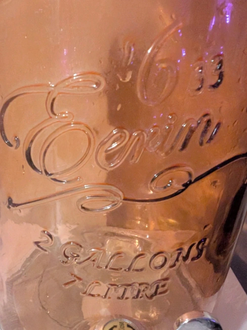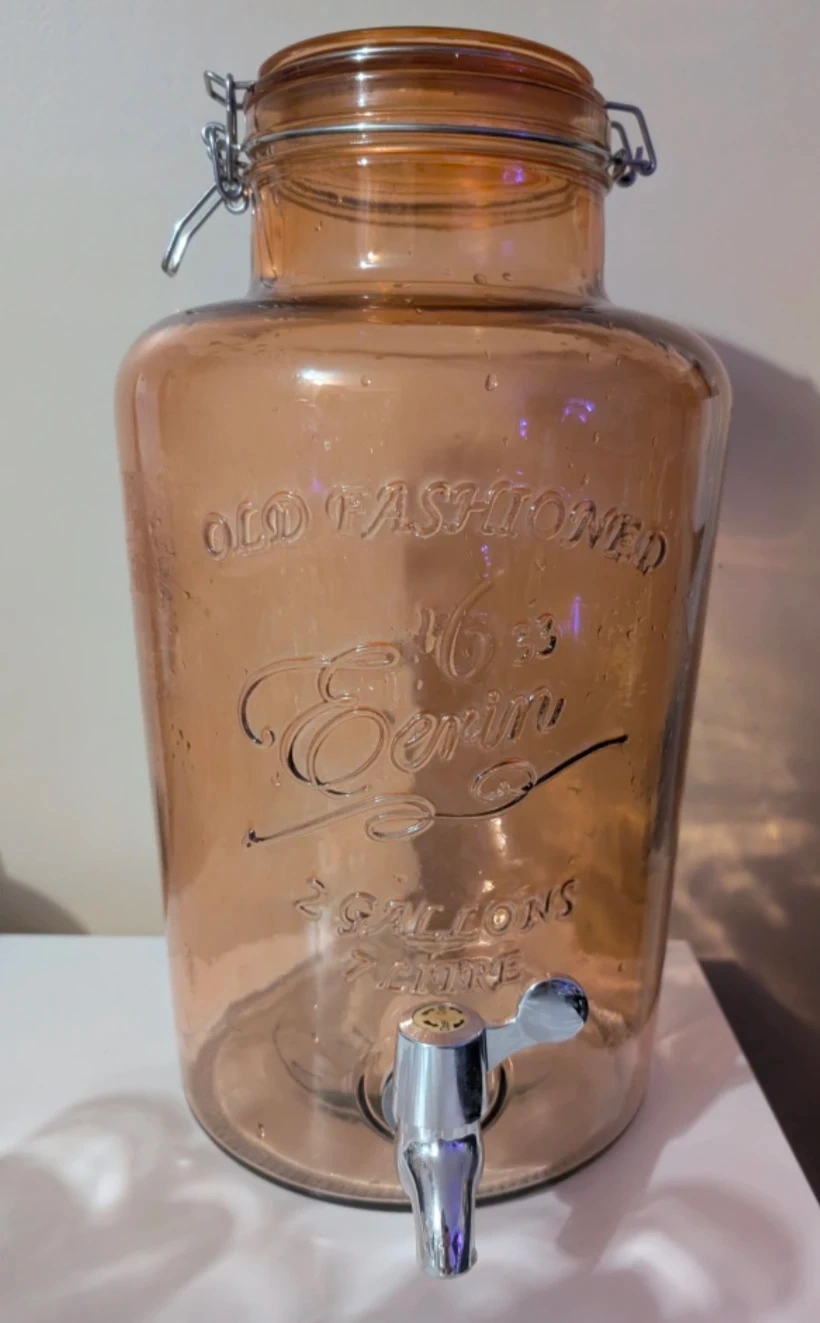 Amber glass drink dispenser with a spigot. Holds 6 1/3 gallons (or 23 litres). Ideal for parties or gatherings!
