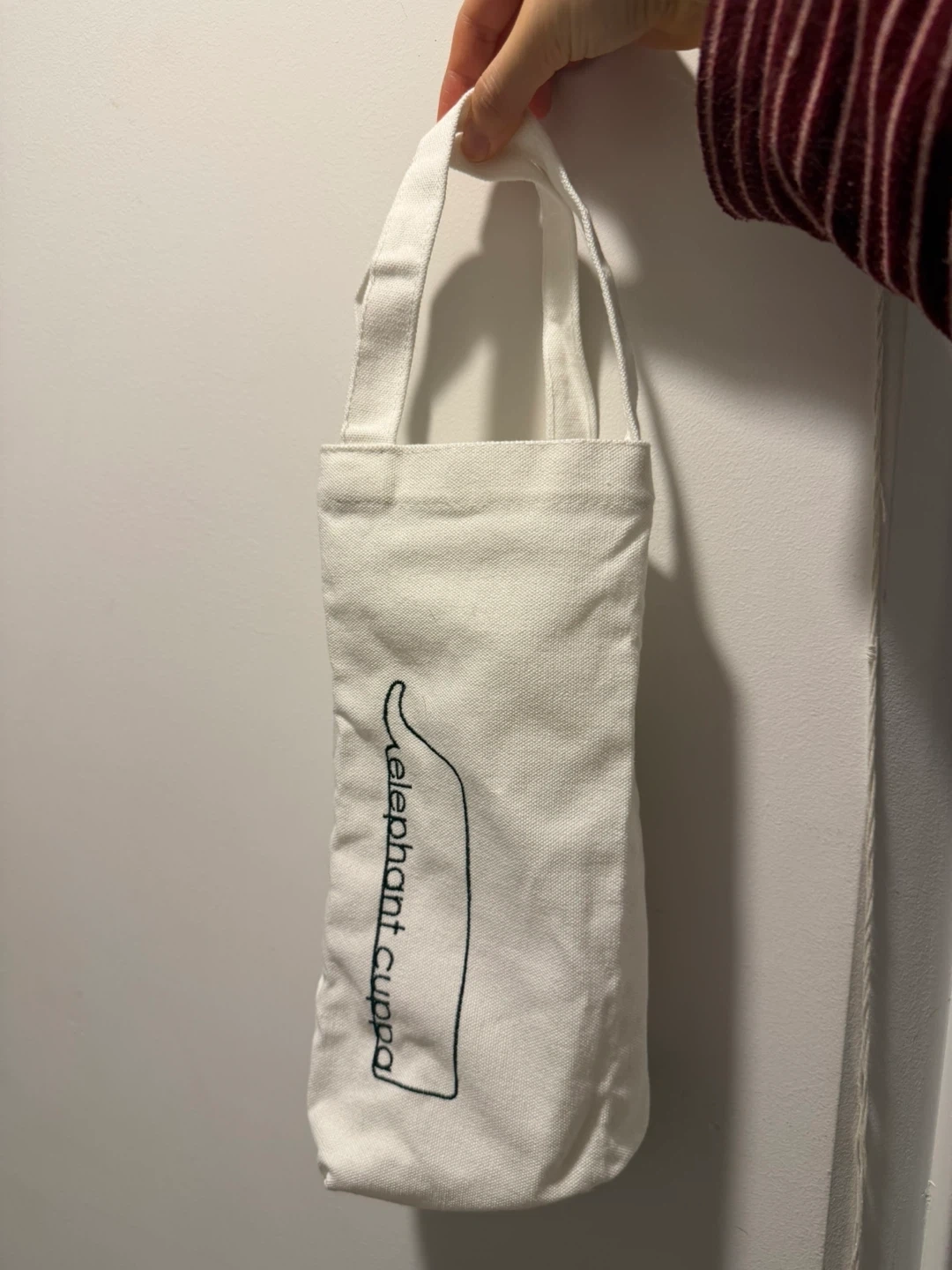 White canvas tote bag with the "elephant cuppa" logo. It's perfect for carrying a beverage or your water bottle Made from durable cotton canvas.