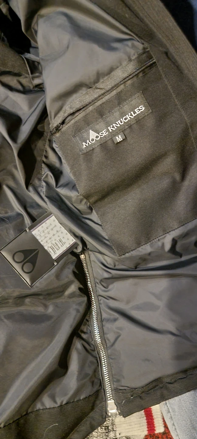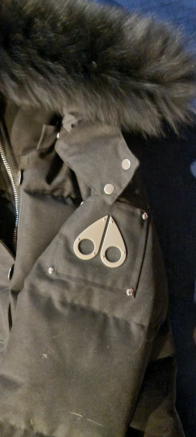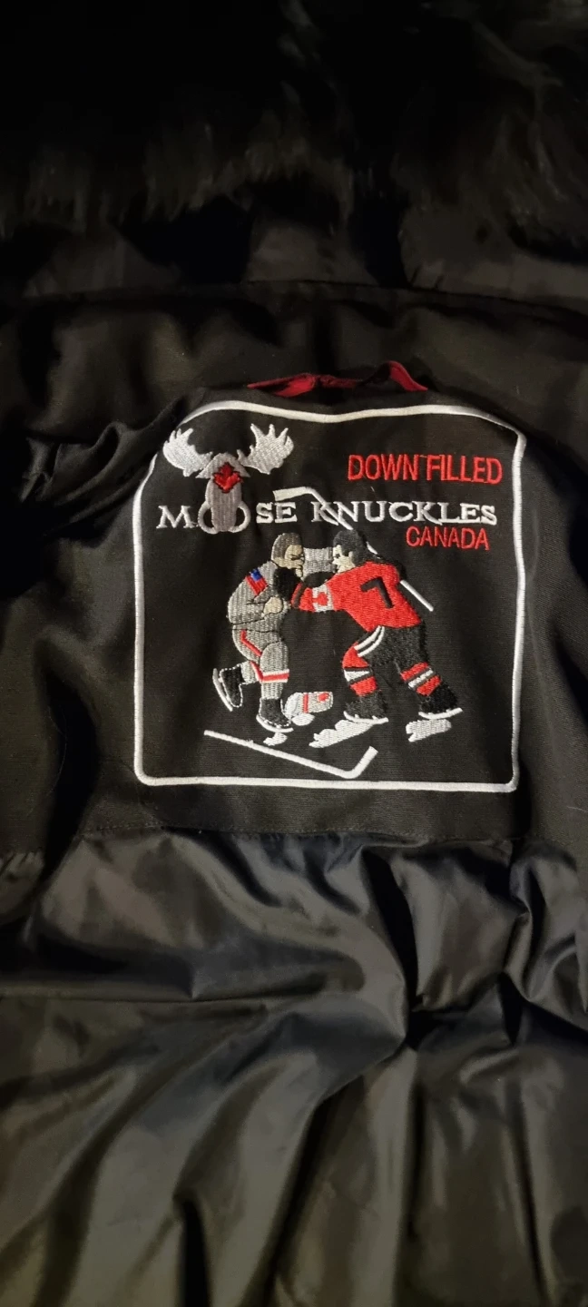 Black Moose Knuckles down-filled parka jacket. Features a fur-lined hood and embroidered hockey graphic inside. Made in Canada. Size ladies medium.