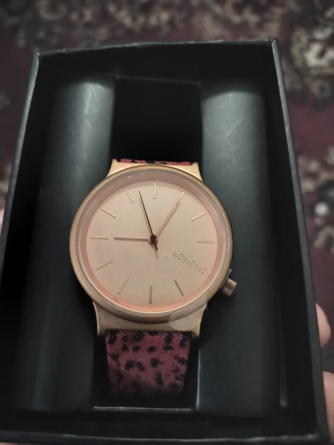 KOMONO Wizard Print Series watch with Japanese Quartz Movement. Features a rose gold metal case and stainless steel back. Water resistant to 3 ATM. Comes with fabric wristband with genuine leather lining.