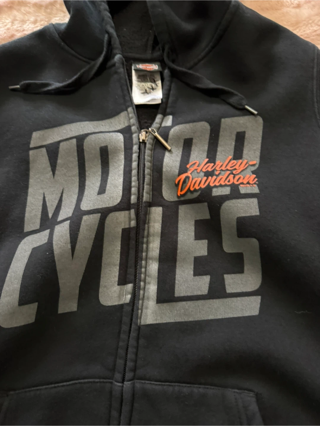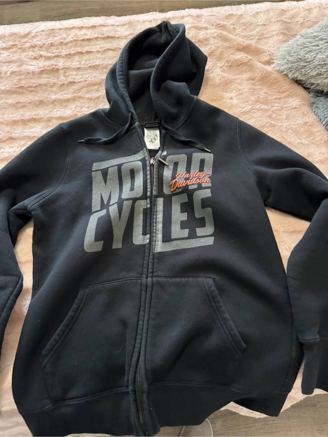 This black Harley-Davidson zip-up hoodie is designed for motorcycle enthusiasts. It features the iconic 'Motor Cycles' graphic on the front. Made from comfortable material, it's perfect for cooler weather or casual wear.