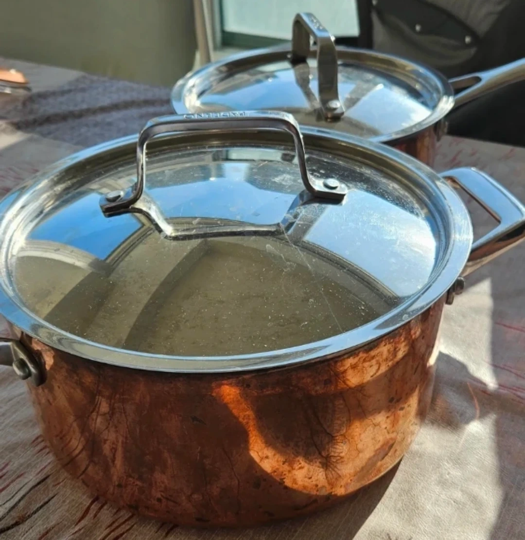 A large All-Clad stock pot made with copper core construction. Includes a clear glass lid with a stainless steel handle. Great for making large batches of soup or stew!