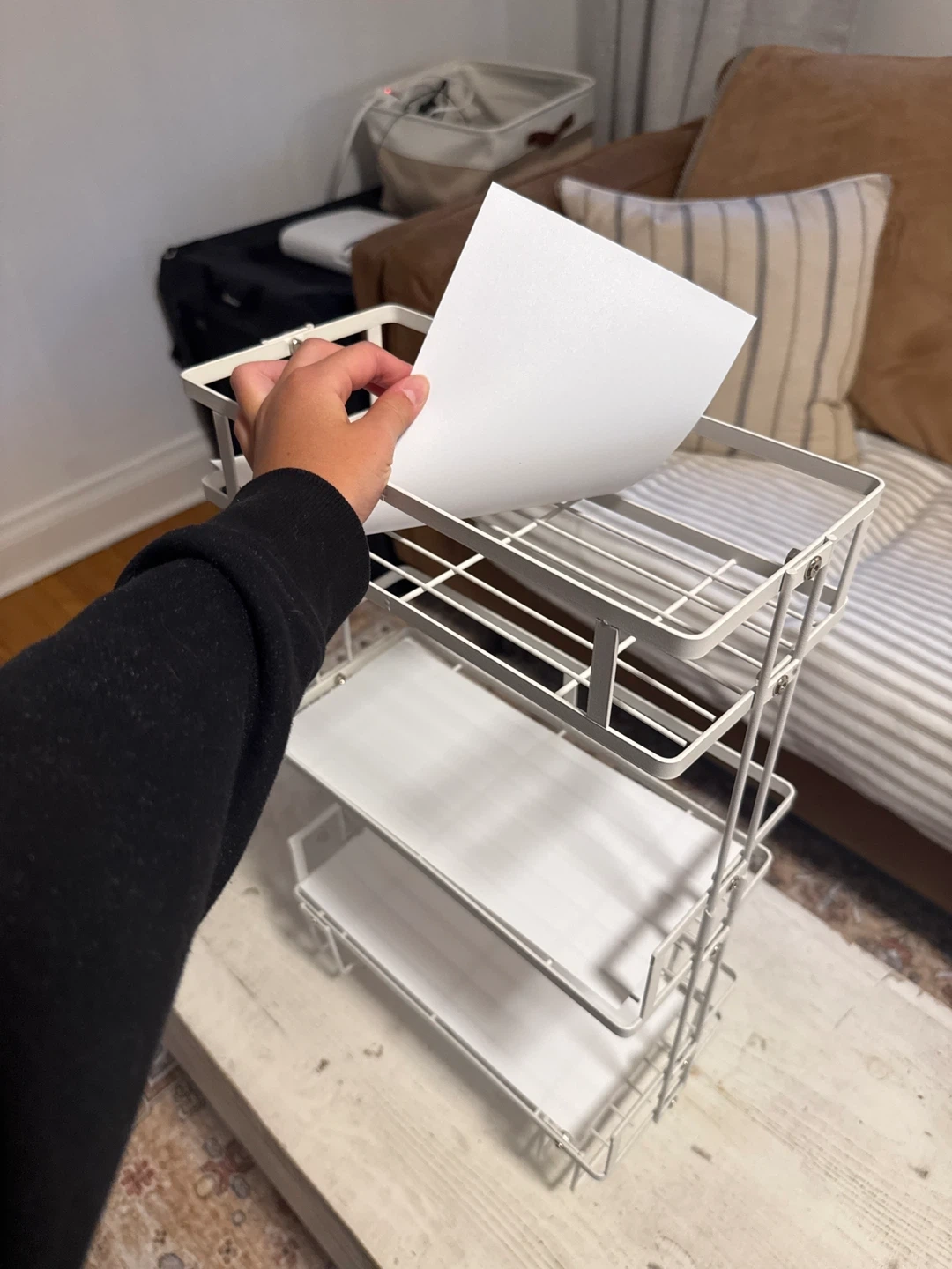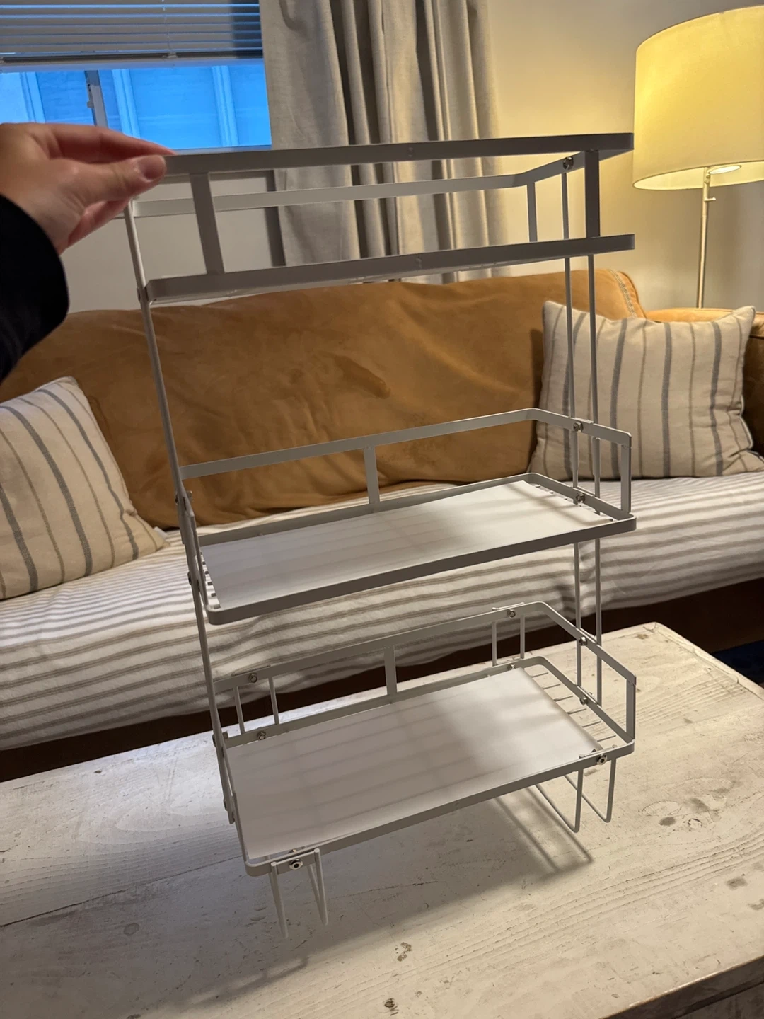 A white 3-tier metal shelf unit for above your toilet with white shelves. It's suitable for organizing toilet paper/Kleenex. Also bathroom products. Great for your bathroom!