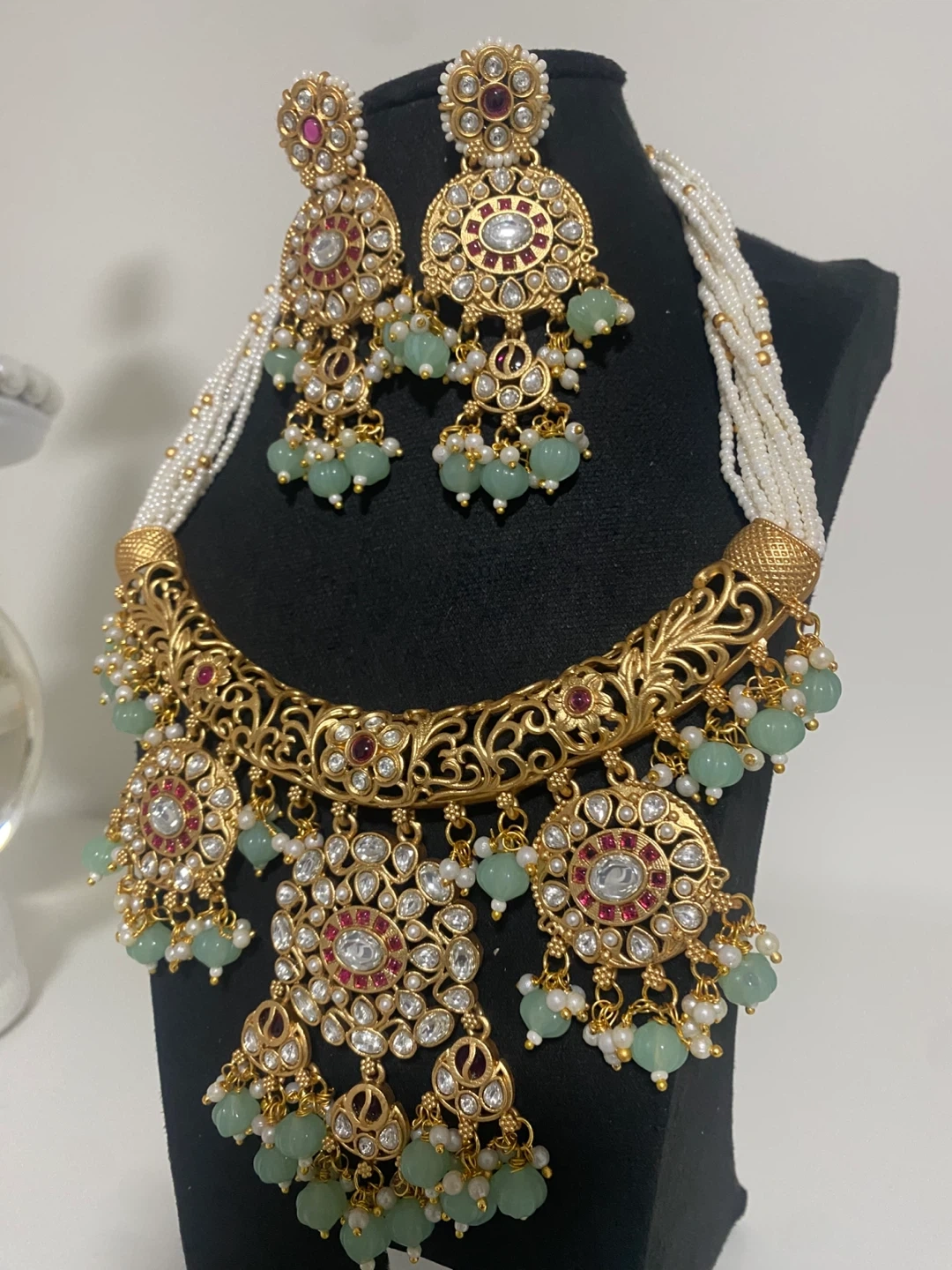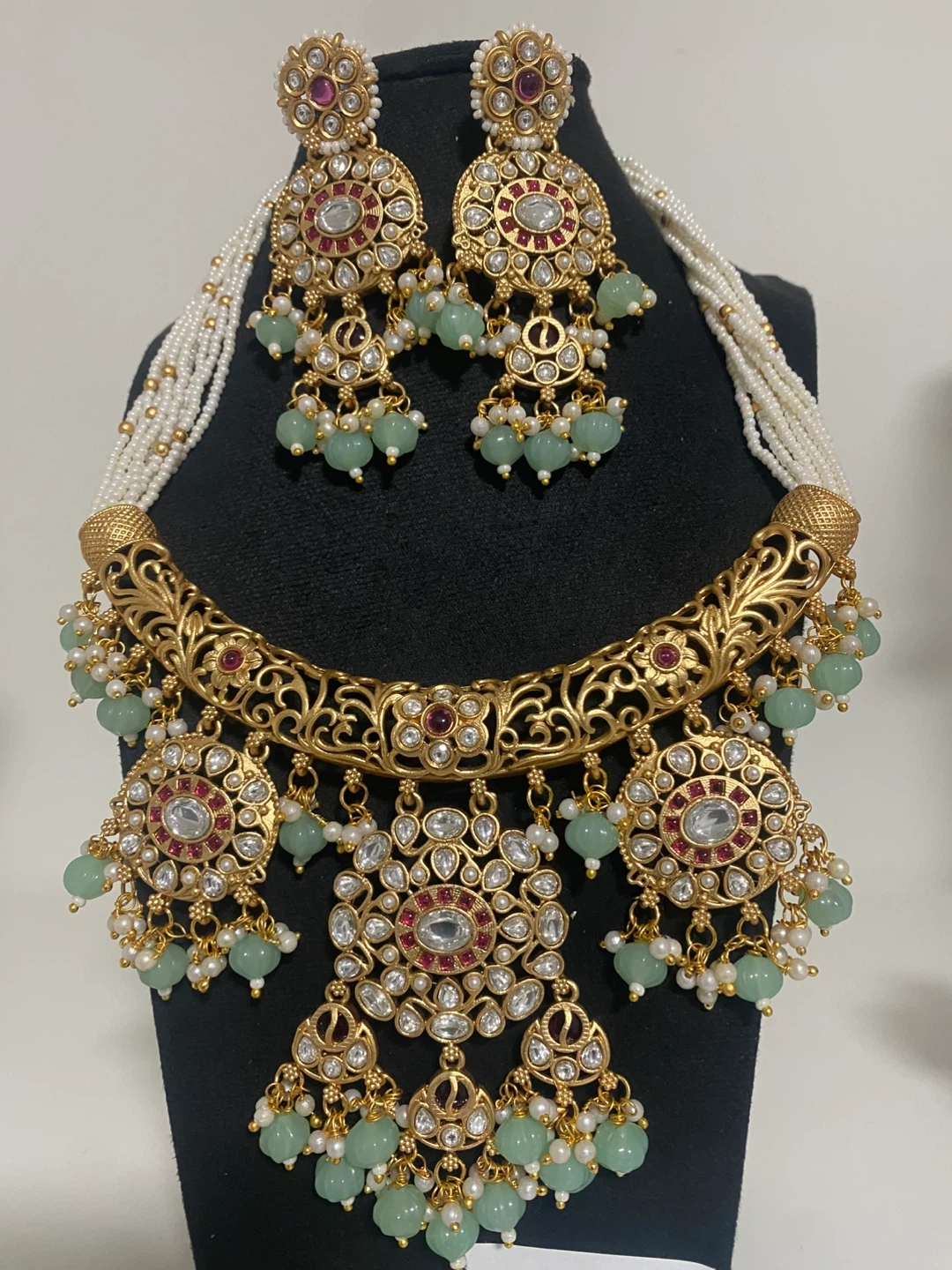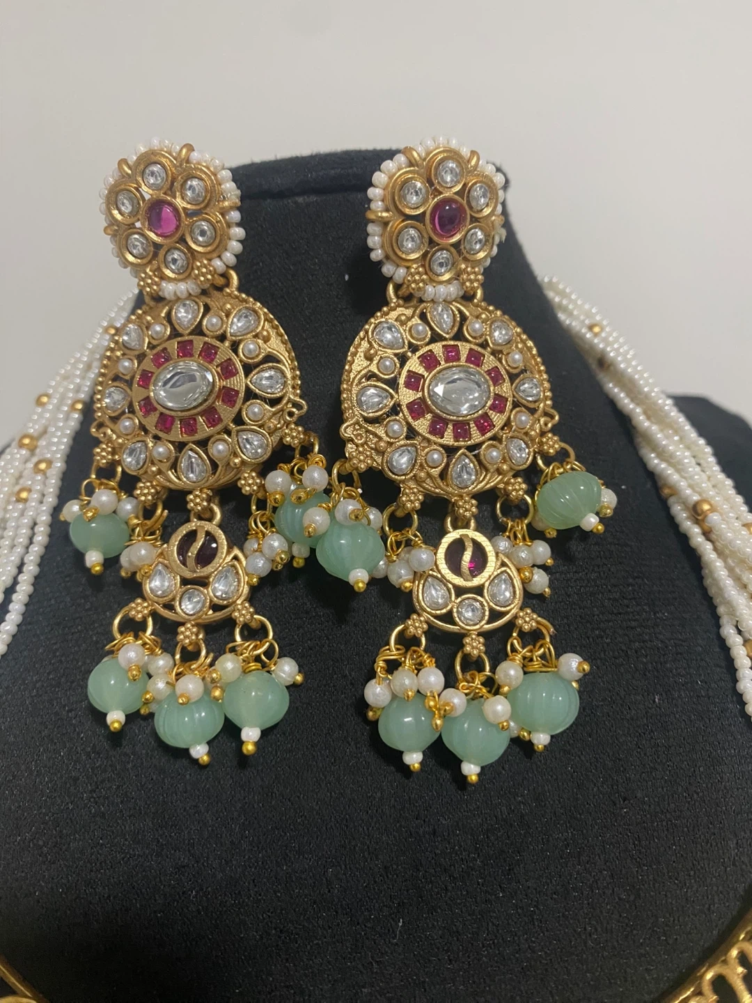 28Gorgeous earrings and necklace set! The set features a gold tone with pearl and green bead accents. It's in great condition and ready for a new home!