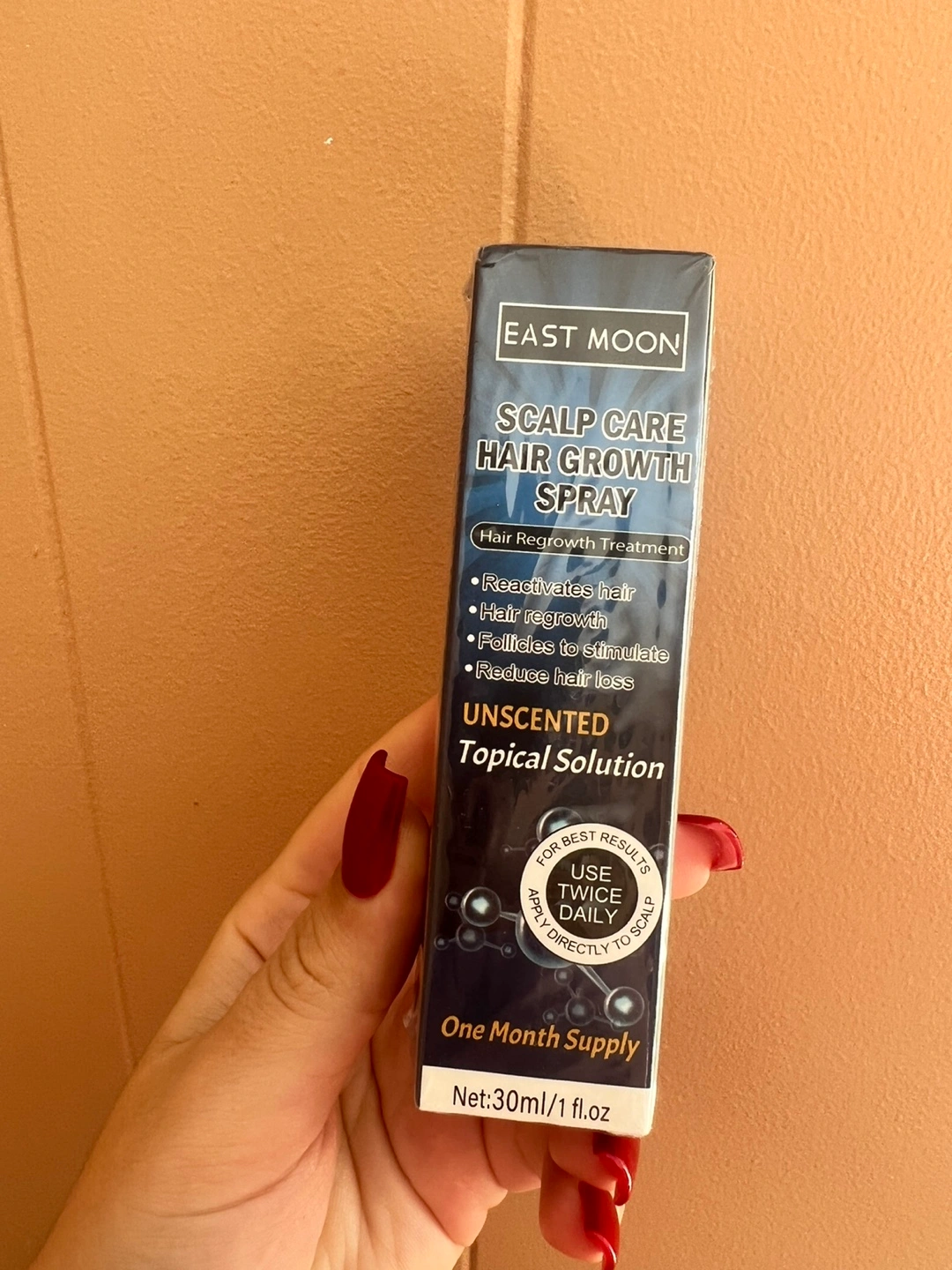 104Selling an East Moon Scalp Care Hair Growth Spray! This unscented topical solution comes in a 30ml/1 fl oz bottle. It's designed to reactivate hair, promote hair regrowth, stimulate follicles, and reduce hair loss. For best results, apply directly to the scalp twice daily. Shelf life is 3 years, with an expiry date of 2028 may 8