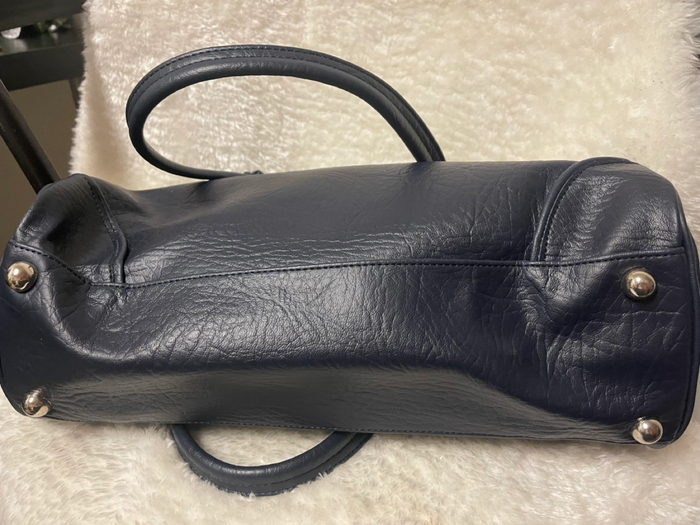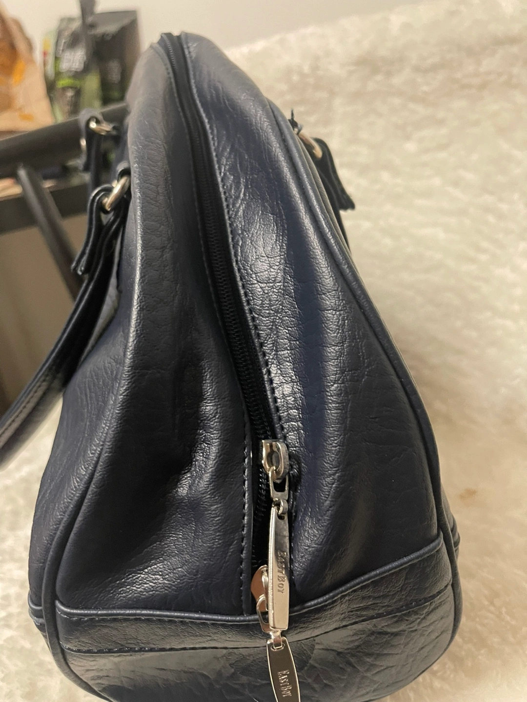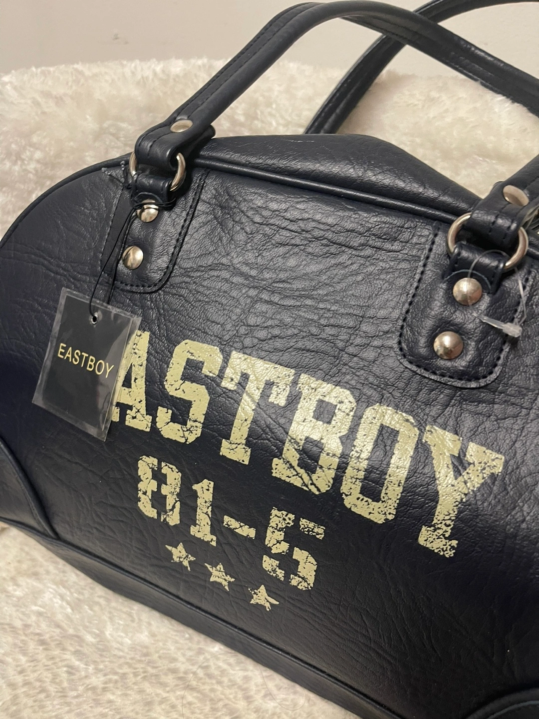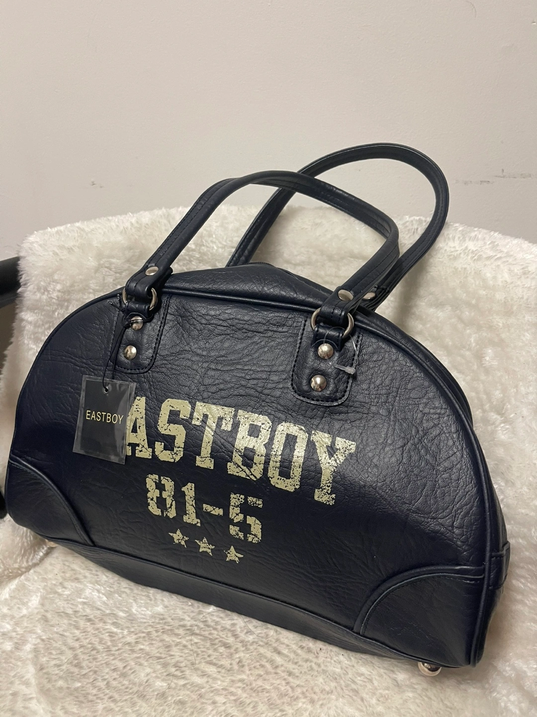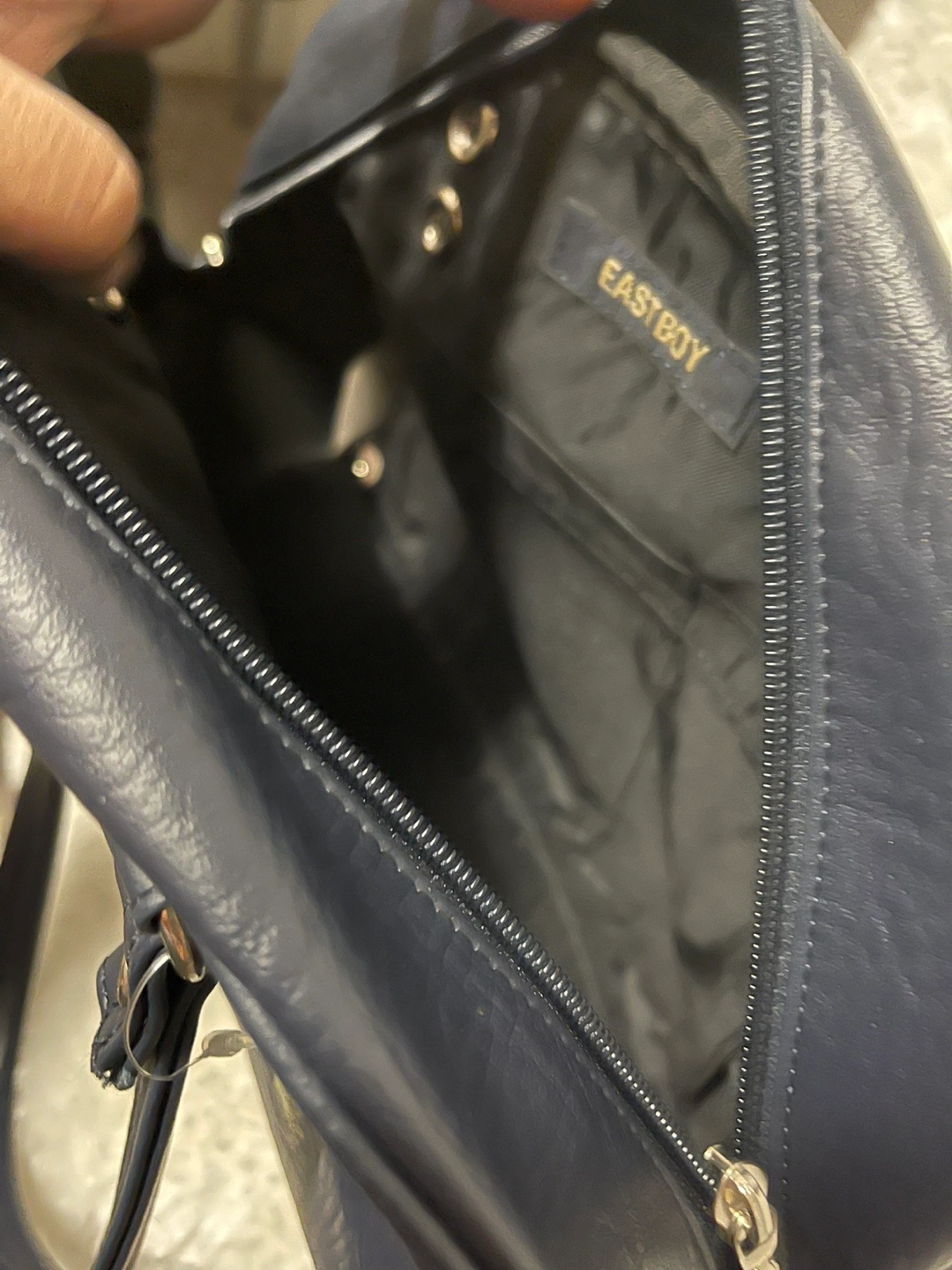 340Dark navy blue handbag. Features two top handles, a zip closure, and metallic accents. Eastboy branding visible on the exterior and interior.