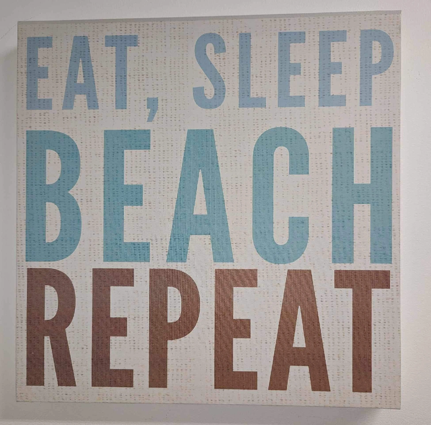 15Canvas wall art with the saying "Eat, Sleep, Beach, Repeat" in blue and brown lettering on a textured background. Perfect for adding a beachy vibe to your home!