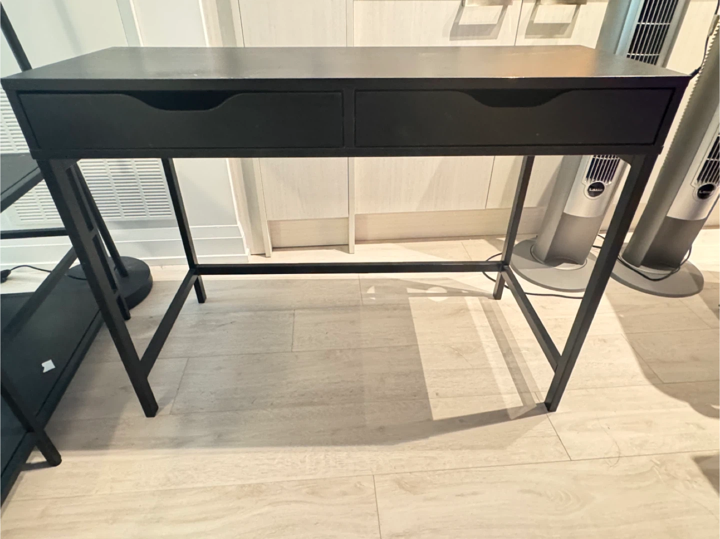 Minimalist IKEA ALEX desk or console table with 2 drawers and sleek black finish. Sturdy metal legs, slim profile—perfect for a home office, entryway, or vanity setup.