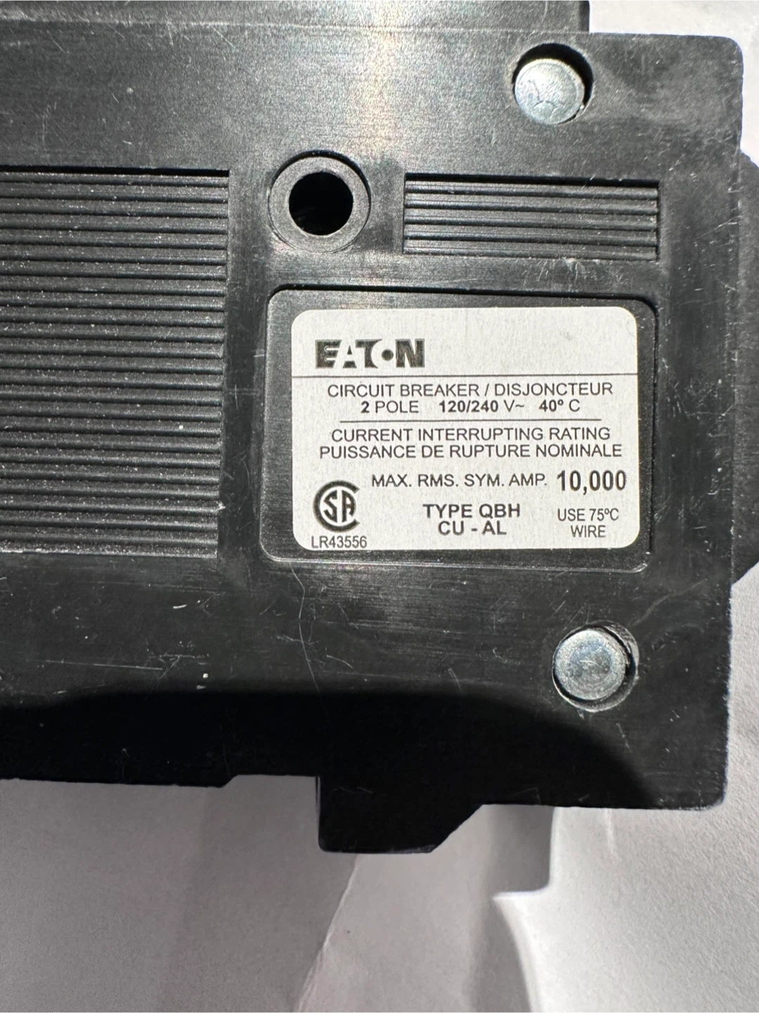 74New - Selling an Eaton 2-Pole circuit breaker rated for 120/240V and 50A. It is a Type QBH CU-AL breaker designed for use with 75°C wire. Max RMS Sym Amp is 10,000. Suitable for EV charger.