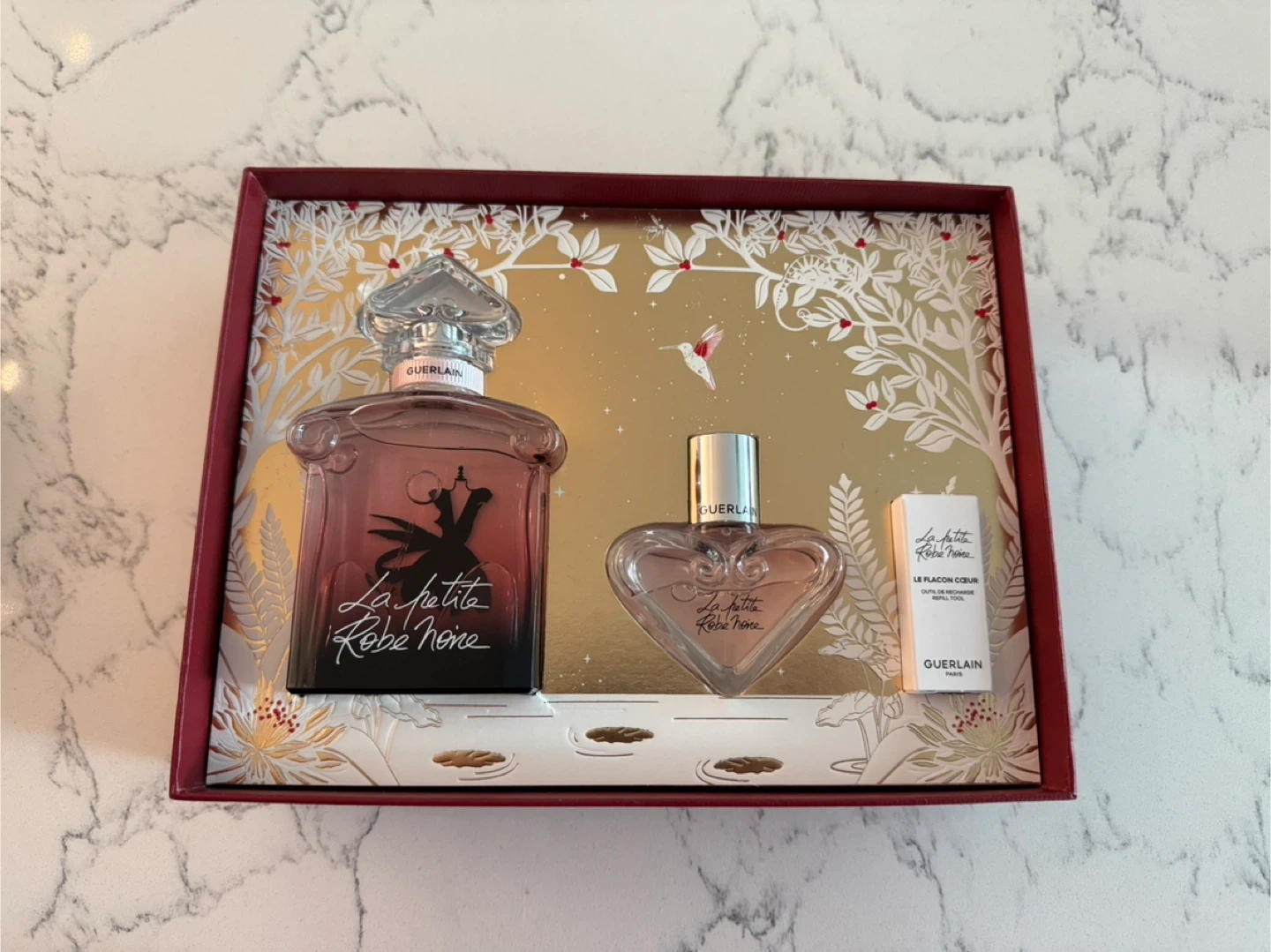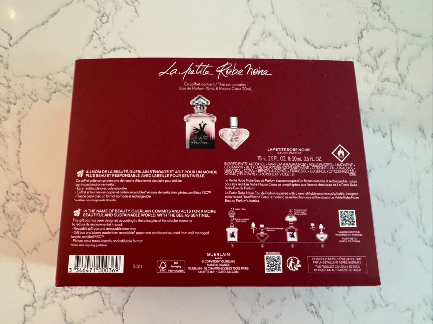 Brand new gift box set of Guerlain La Petite Robe Noire eau de parfum. Comes with full bottles in 75ml size and 20ml travel size, and a refill tool.
