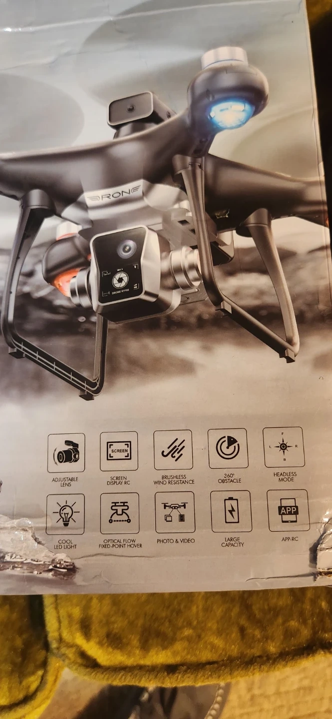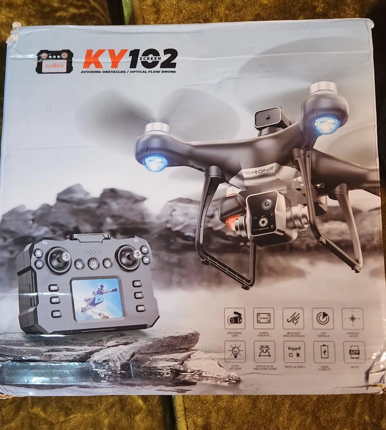 This is a KY102 drone with optical flow and obstacle avoidance. It features a screen display RC for control. The drone is capable of photo and video recording.