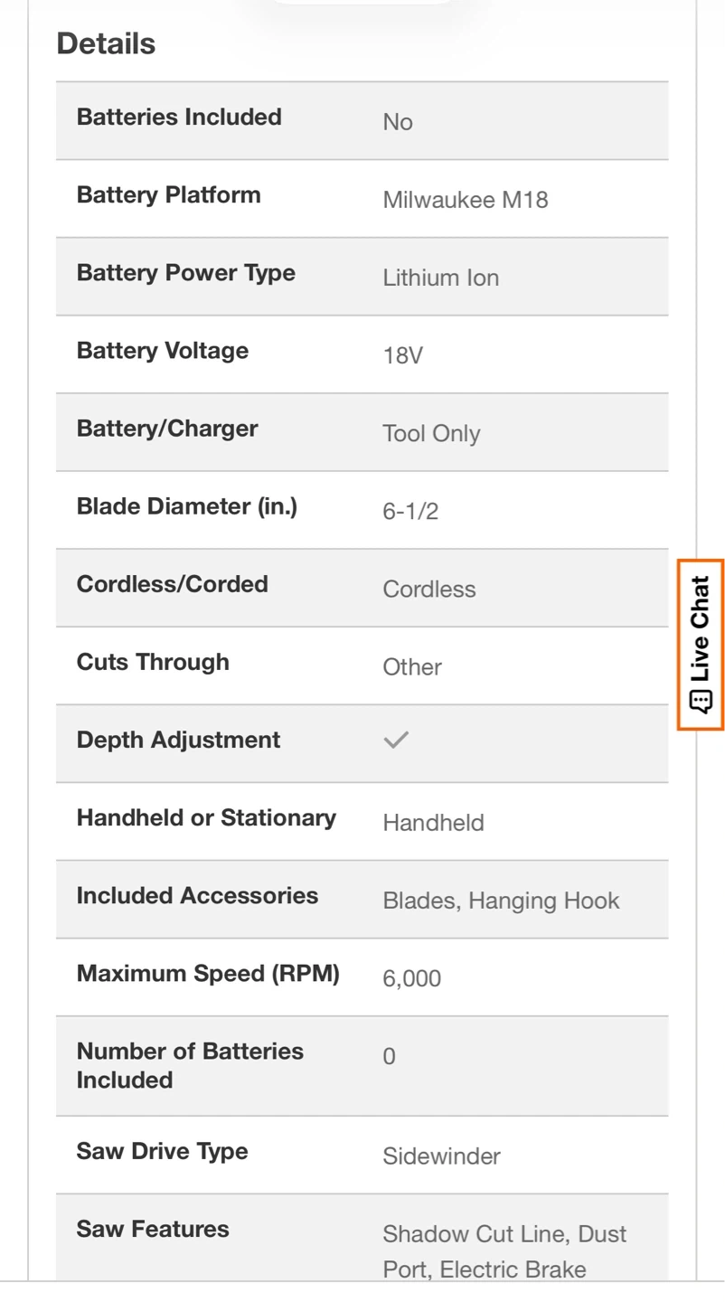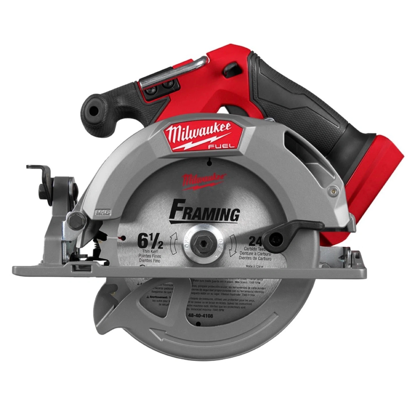 This Milwaukee M18 FUEL cordless circular saw features a 6-1/2" blade and brushless motor for powerful performance. It has a maximum speed of 6,000 RPM. Includes blades and hanging hook. Tool only, battery not included.