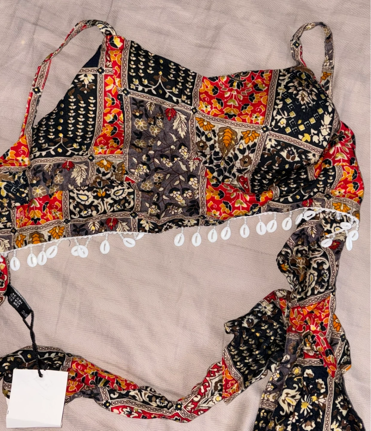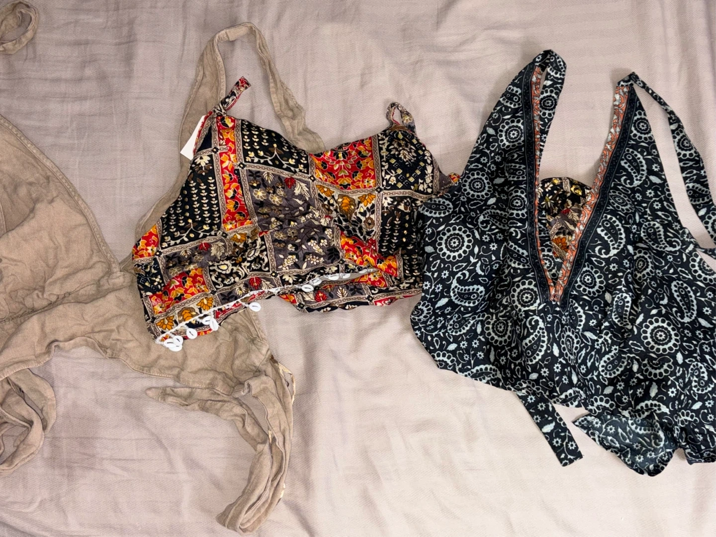 Selling a lot of three women's tops. Included are two halter tops with unique patterns and a white tie-up crop top.