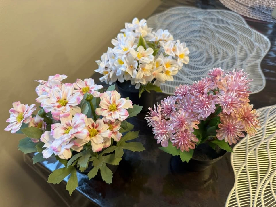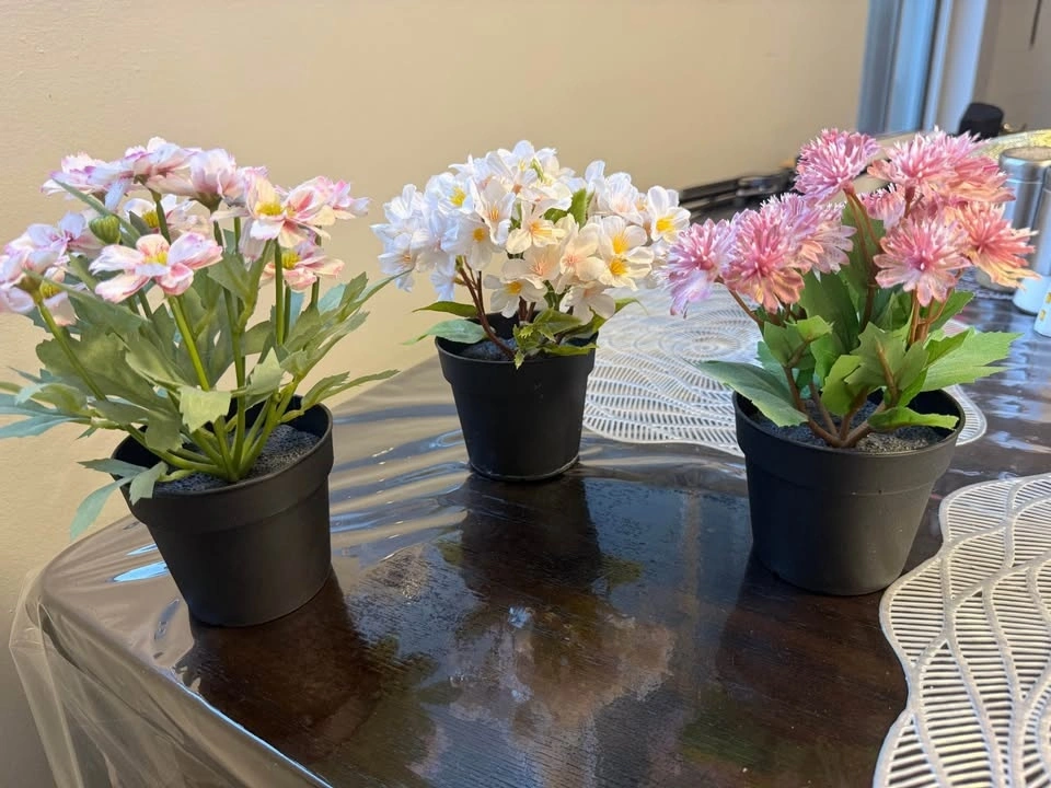 Cute artificial flowers. Has 3 pots with pink and white flowers. Great for home decor. Very good quality. Like NEW.