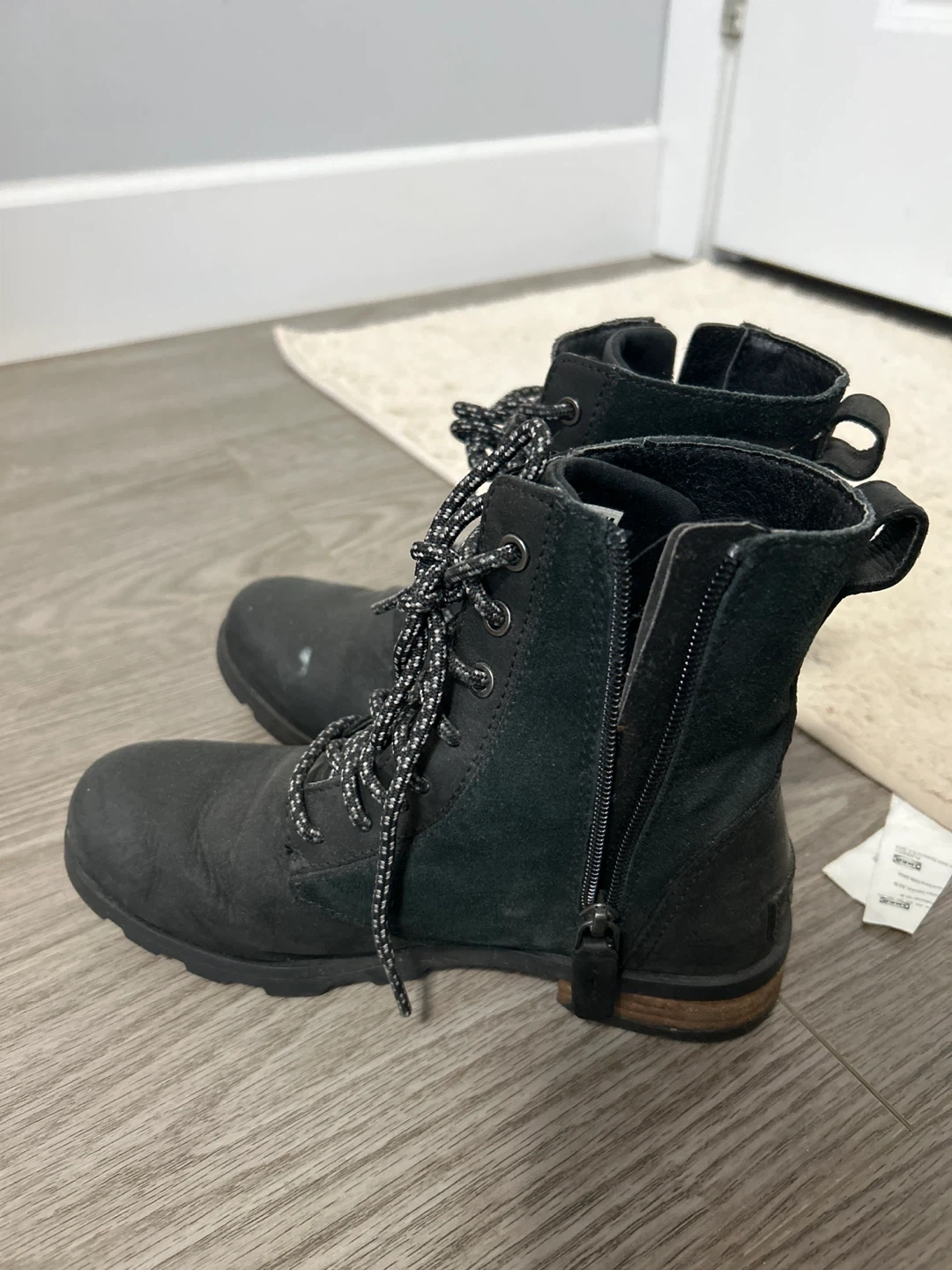 Selling a pair of Sorel women's boots, model NL3309-010 in size 6. They show some signs of wear, but still have plenty of life left! These boots feature a lace-up design with a side zipper for easy on and off.